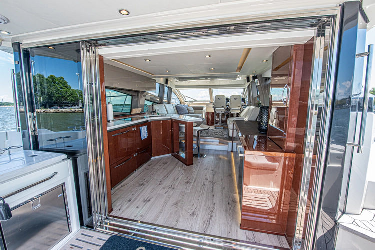 The access to the salon and galley area is through a sliding glass door. All three glass door panes can slide to starboard or port, and when slid to port, all disappear to create true indoor to outdoor flow from the aft galley into the cockpit.