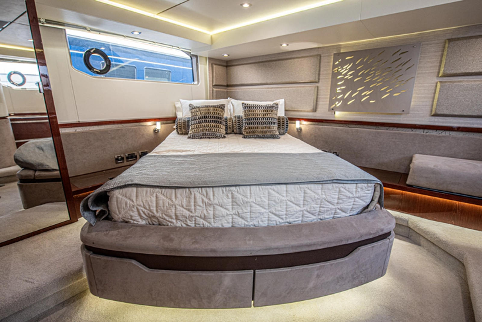 Powered by Caterpillar C12.9L inboards with direct drives, the boat is nimble and easy to maneuver thanks to bow and stern thrusters, all integrated into a joystick. Below is a list of significant factory options and upgrades: