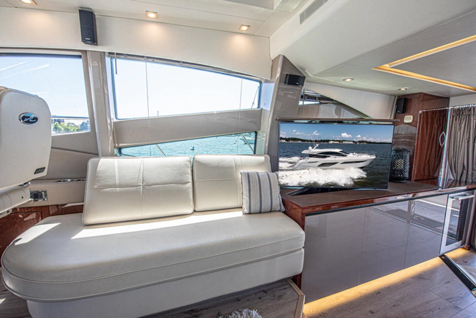 The salon sits forward with opposing facing seating. On the starboard side is a two-person sofa finished in Ultraleather, while the port side sofa is a larger L shape and fitted in Ultraleather. Ottomans have storage and the lids can be flipped from a cushion to hard top surface, which lets each ottoman double as a coffee table. The port side lounge also pulls out to convert to another sleeping area – making the boat truly capable of sleeping eight comfortably through three staterooms and the convertible sofa.