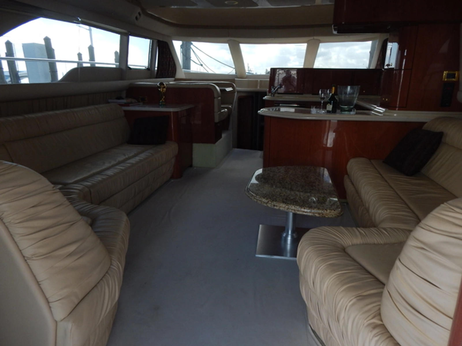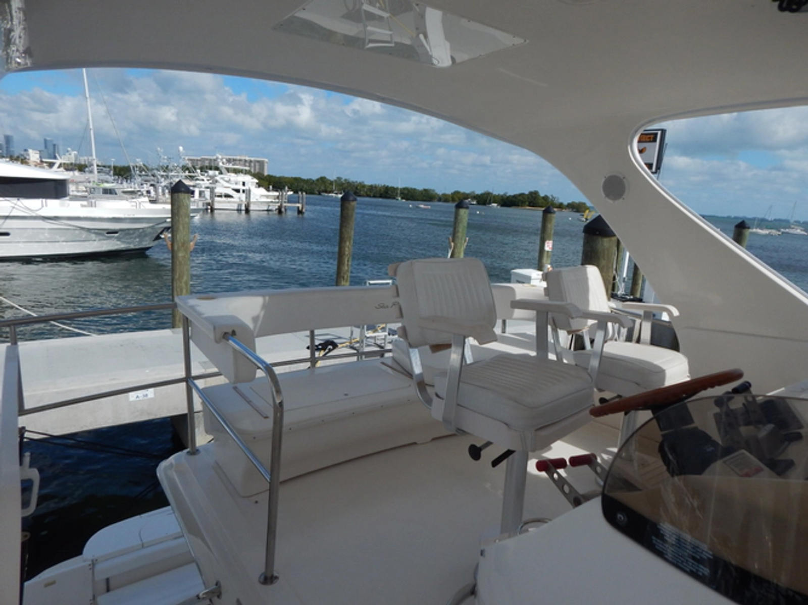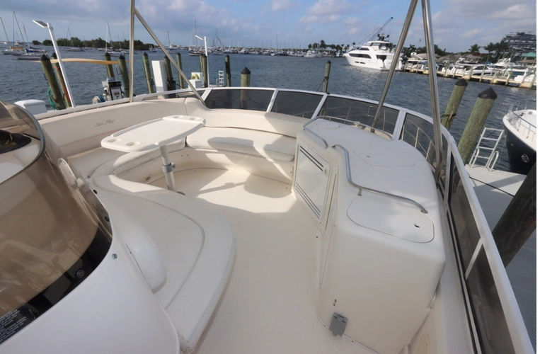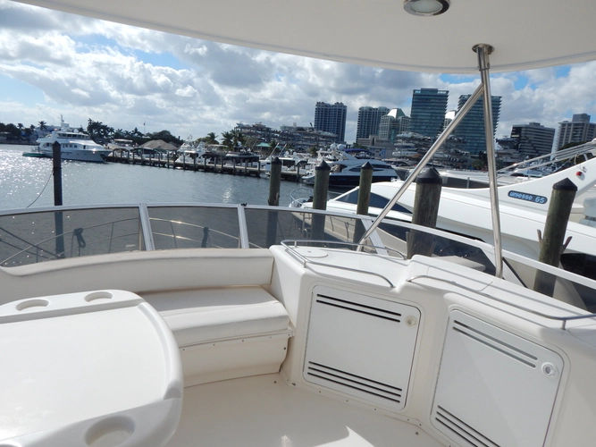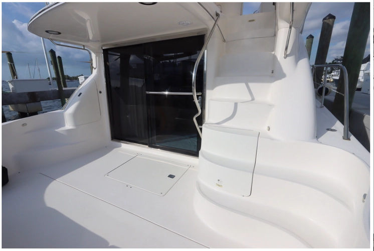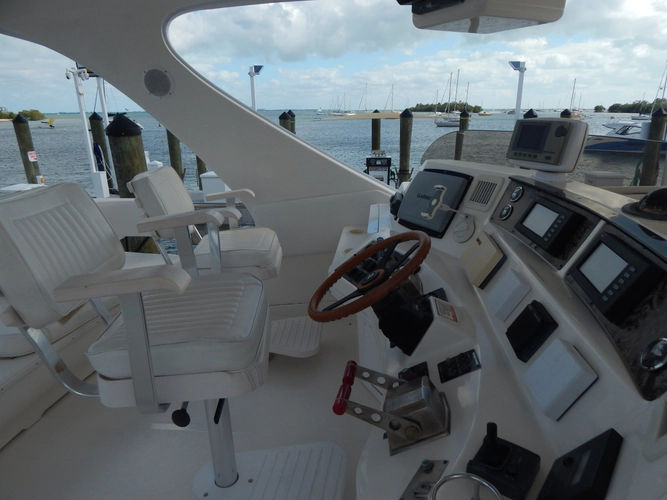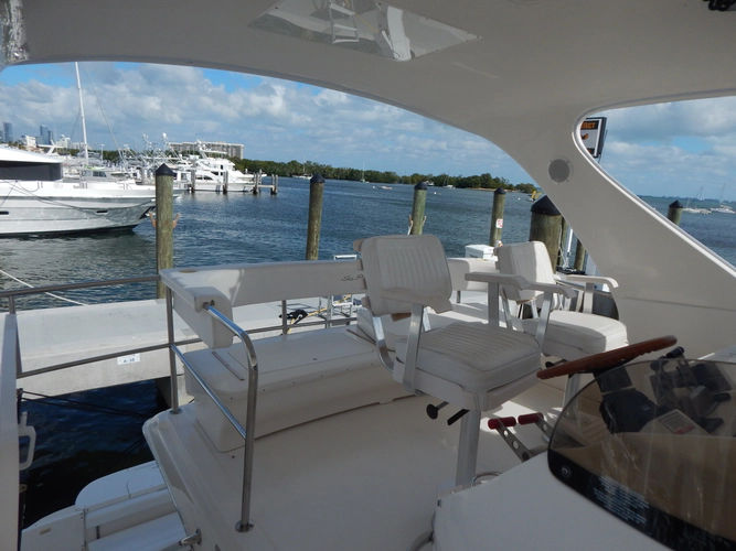 *The helm area on the fly bridge is surprisingly large. It will accommodate all of your family and friends with two electric Stidd chairs, a cushioned bench seat overlooking the cockpit and a comfortable wrap around seating area forward that includes a fully serviced wet bar.- CHART PLOTTER: Garmin 5212