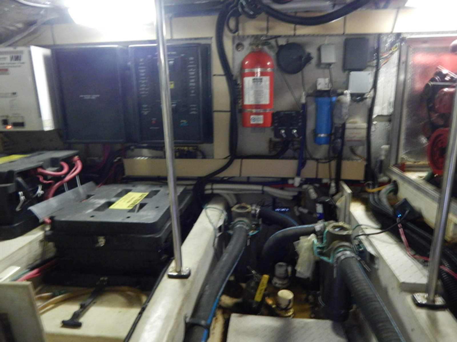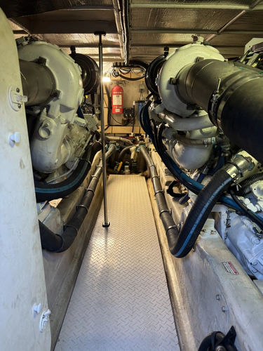 - 24- and 12-volt electrical system powered by two groups of two 8D 12 volt lead acid batteries in series to make the 24 volt system. One 12-volt group 24 maintenance free battery for generator starting. All batteries are located in the engine room. Additional two 12-volt maintenance free batteries group 27 in series located in the forward bilge to feed the 24 volt bow thruster and windlass. All batteries are secured in acid resistant boxes with covers except for the generator starting battery. Main shut-off solenoid switches in the engine room with controls at the main electrical panel. Combined DC/AC main electrical panel located to port of companionway. Circuit monitoring is provided by battery voltage and load amp meter. All DC system and equipment are protected at main panel in the engine room and at salon panel with main solenoid and branch circuit over-current protection resettable breakers. Intermediate fuse panel at cockpit and bridge. All wires are marine grade color coded and are well routed and supported where sighted. Batteries cross over relays controlled at helm station.