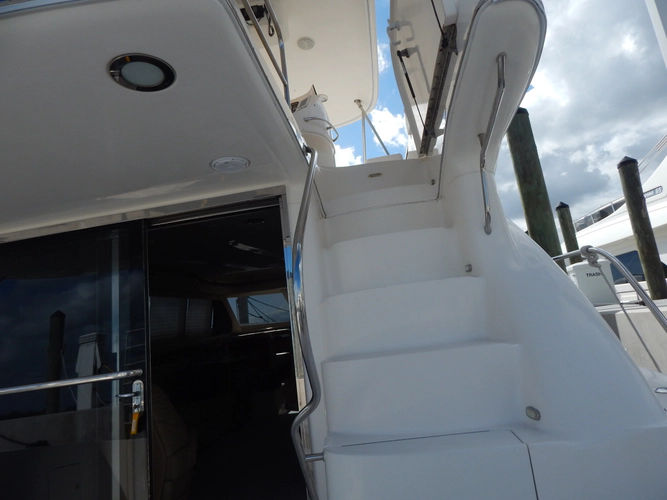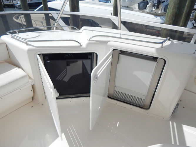 The full fiberglass hardtop with enclosure and electronics box helps make sure everyone on the flybridge stays comfortable while underway, especially when the standard 24,000 BTU air conditioning system is running.