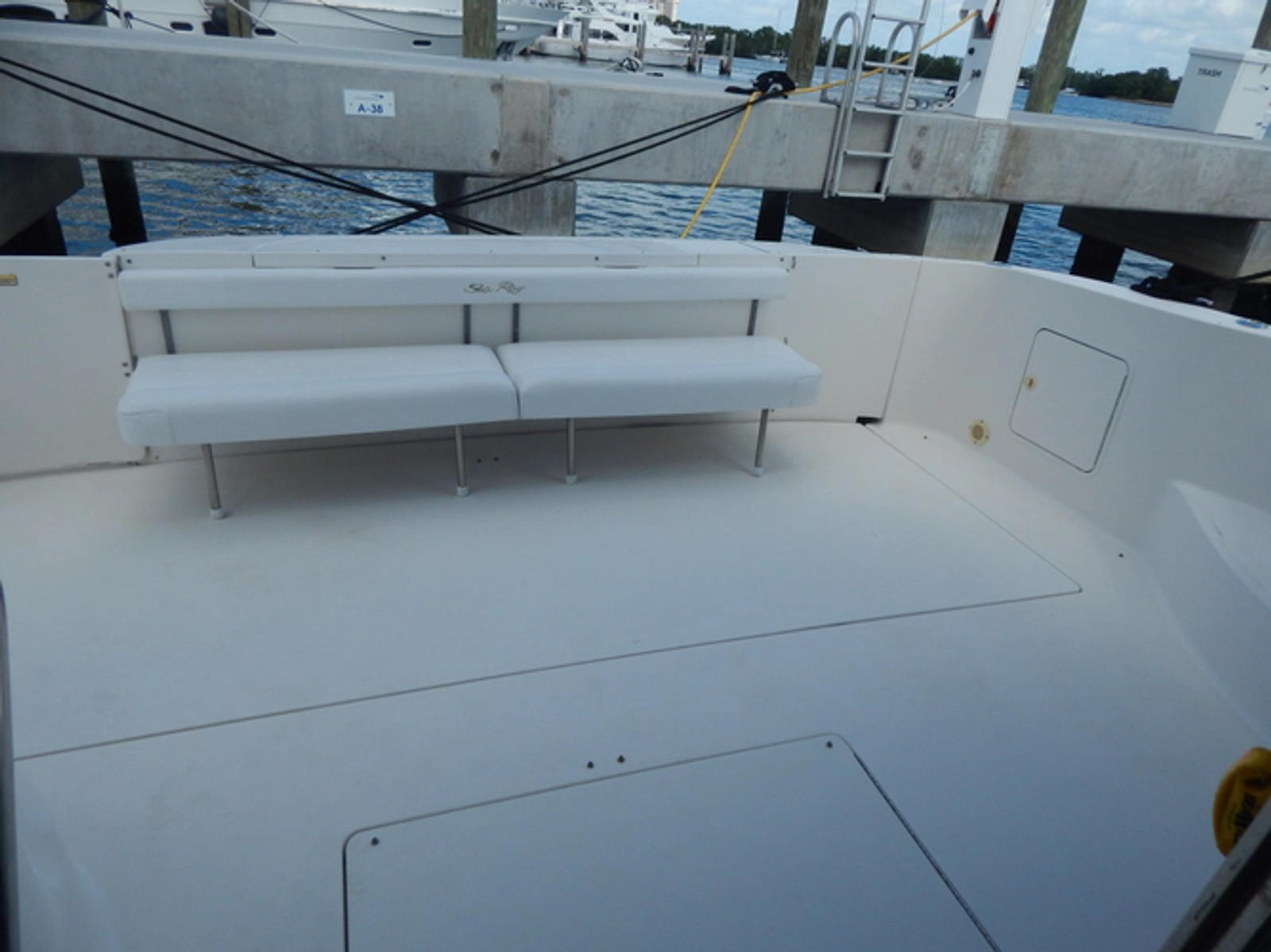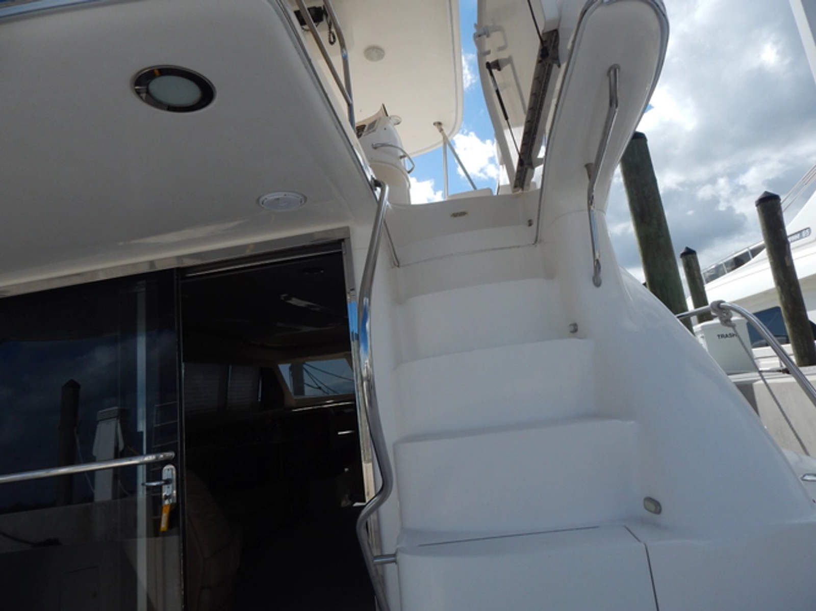 Wide, molded steps lead to the spacious aft cockpit where there's extra seating space and storage bins, as well as a transom door that opens onto an extra wide swim platform.