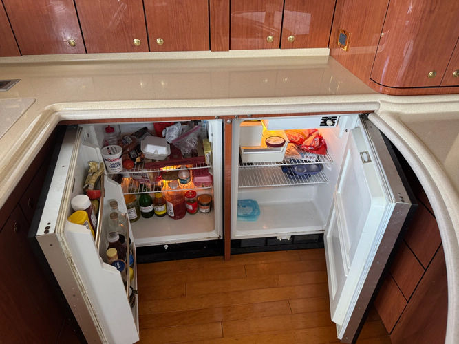 There's a cozy dinette opposite the galley with comfortable seating for four and a phone jack. The bright, open galley with wood flooring and cabinetry has all the latest appliances including a flush-mounted three-burner cooktop, microwave - convection oven, under-counter refrigerator and freezer, and a convenience package with coffee maker, trash compactor - even glass decanters.