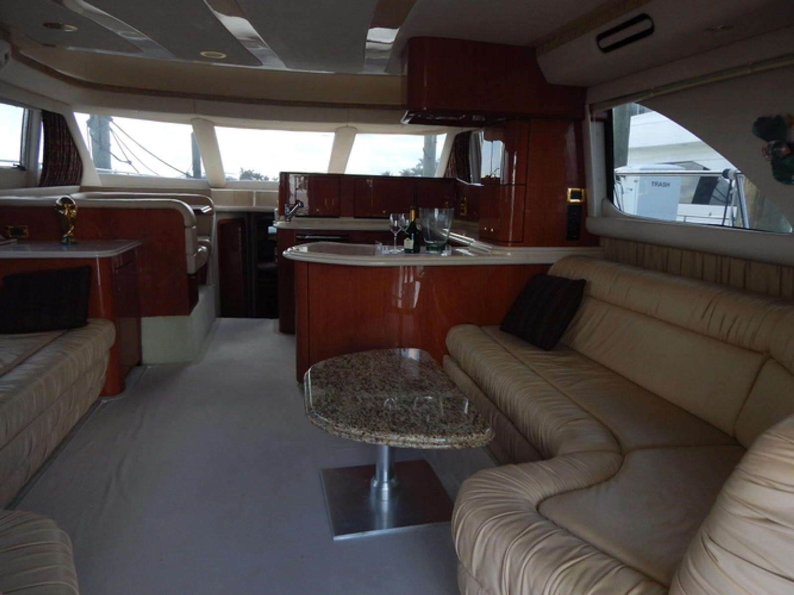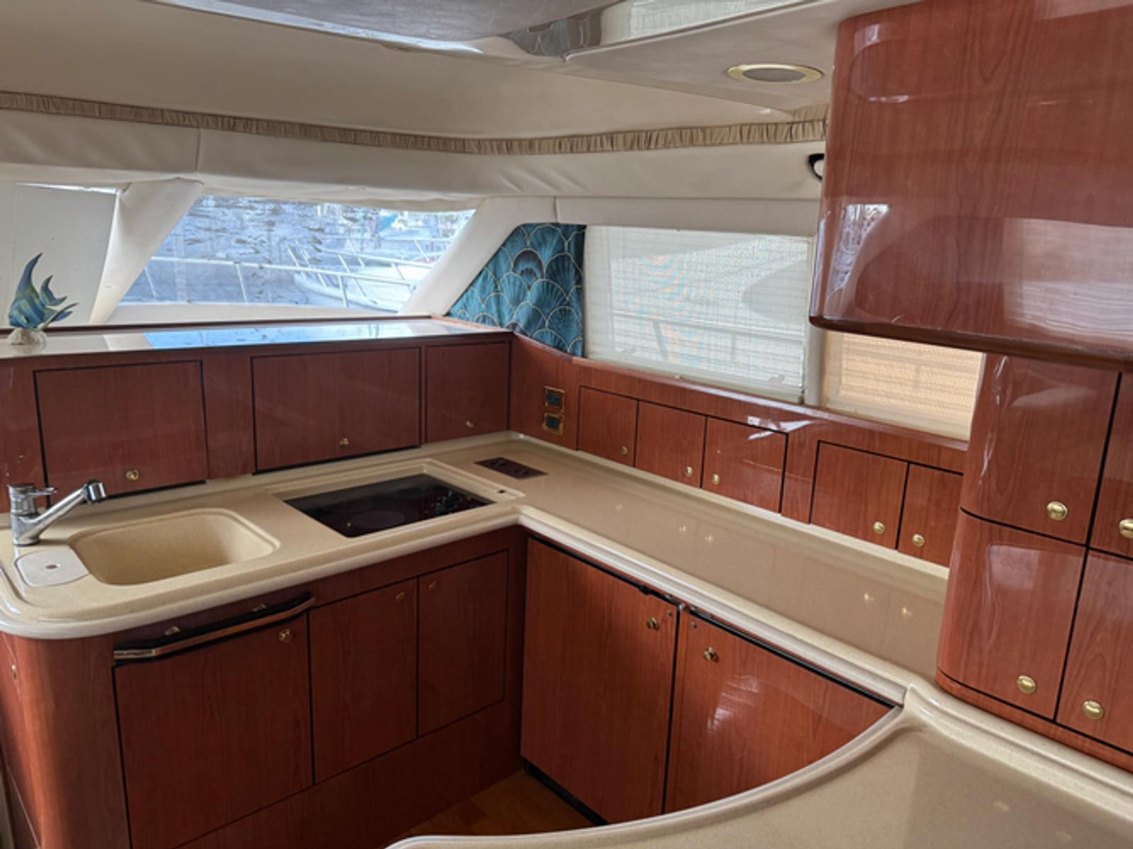 - The galley is very functional and bright. Positioned in the forward salon surrounded by windows. Cherry cabinetry provides ample storage space for all of your galley needs and expansive counter space make meal prep a breeze.