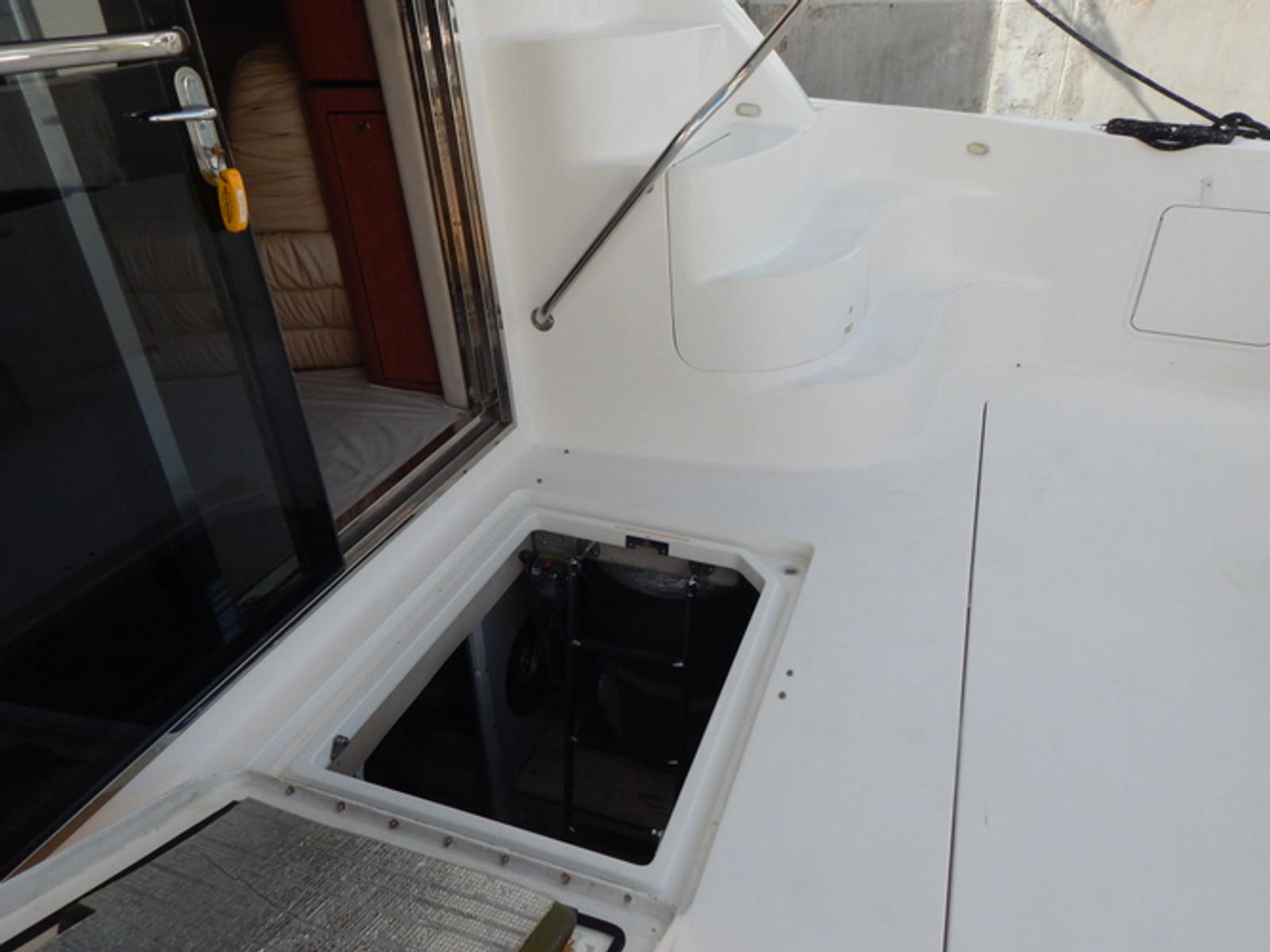 A fiberglass hardtop and enclosure complete the comfort. There's also easy access to the bilge area thanks to a gas-assisted hatch, and stainless-steel ladder.