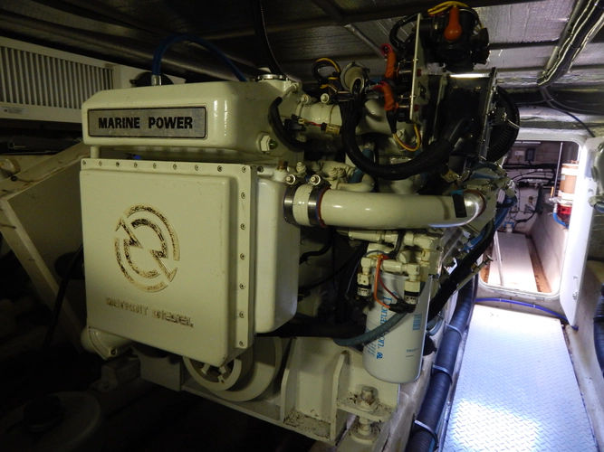 All the way forward is the master with centerline queen berth and private head and shower.A large hatch in the cockpit sole provides access to the engines room forward and large lazarette aft. Bilges are tidy and the space is well kept.