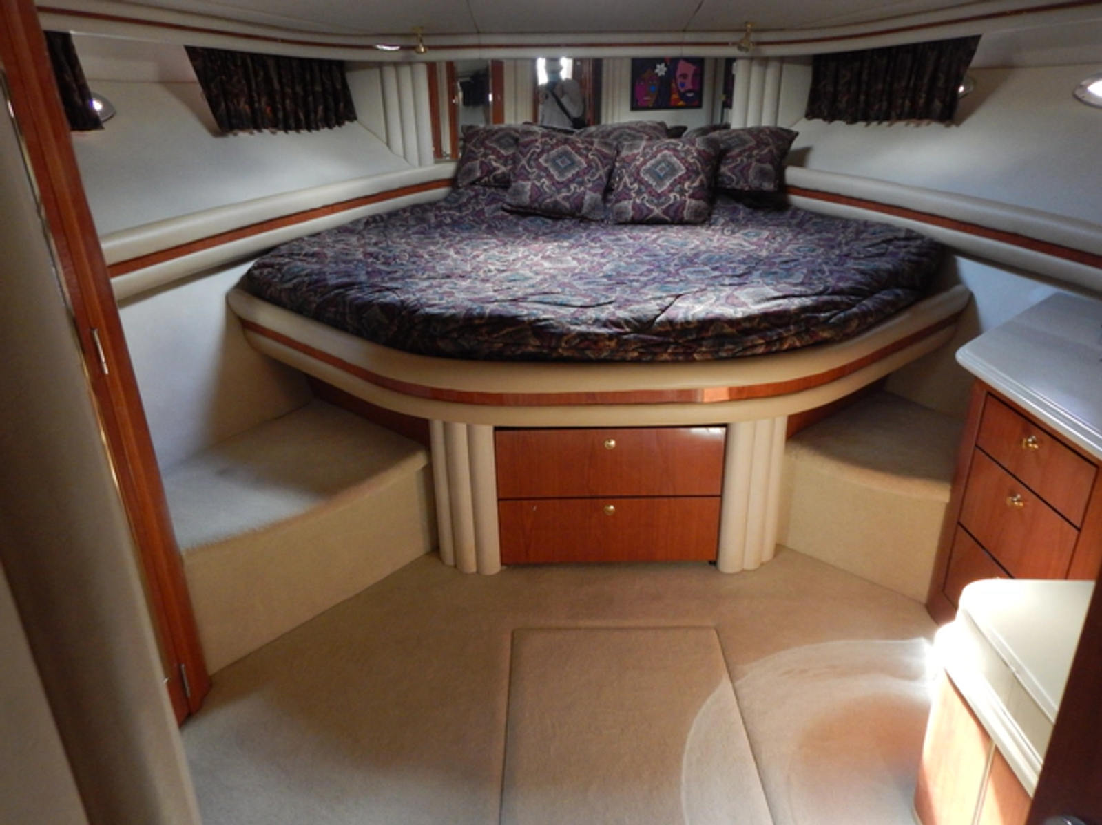 The master stateroom has a queen size pedestal bed. To starboard is a lighted vanity counter with drawers underneath. The mirror opens for storage behind. To port is a cedar lined full height closet with lights and mirrors. Aft of this closet Is a Beveled Mirrored Rope Locker Bulkhead