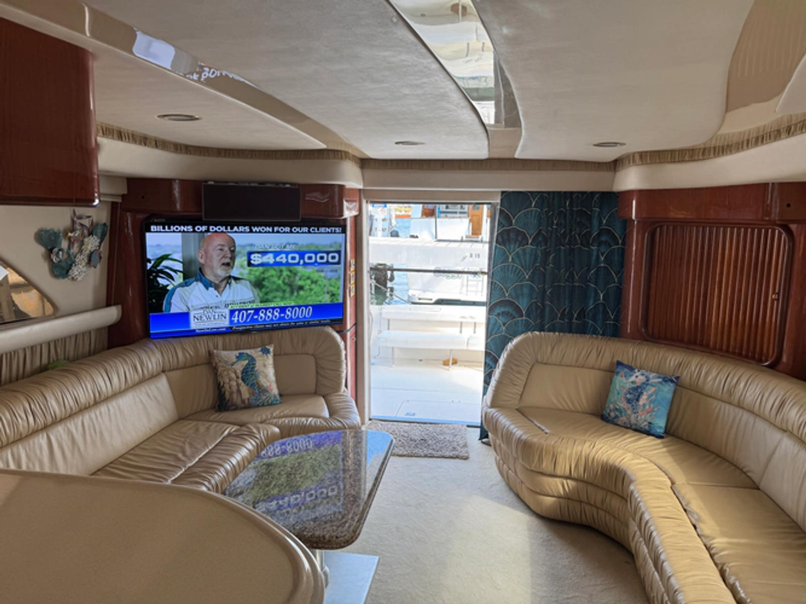 The master stateroom has a queen-size bed and innerspring mattress, beveled mirrors, and an entertainment center with a TV - VCR - radio combination and Bose Acoustimass three-speaker system.