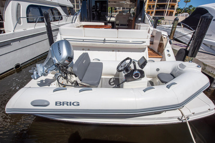 The full-beam hydraulic swim platform makes tender deployment easy while maintaining usable storage. The cockpit features teak decking, a high-gloss table, and a retractable sunshade for comfort in any conditions. To starboard, the grill and icemaker integrate seamlessly with the salon wet bar, creating an ideal entertaining space.