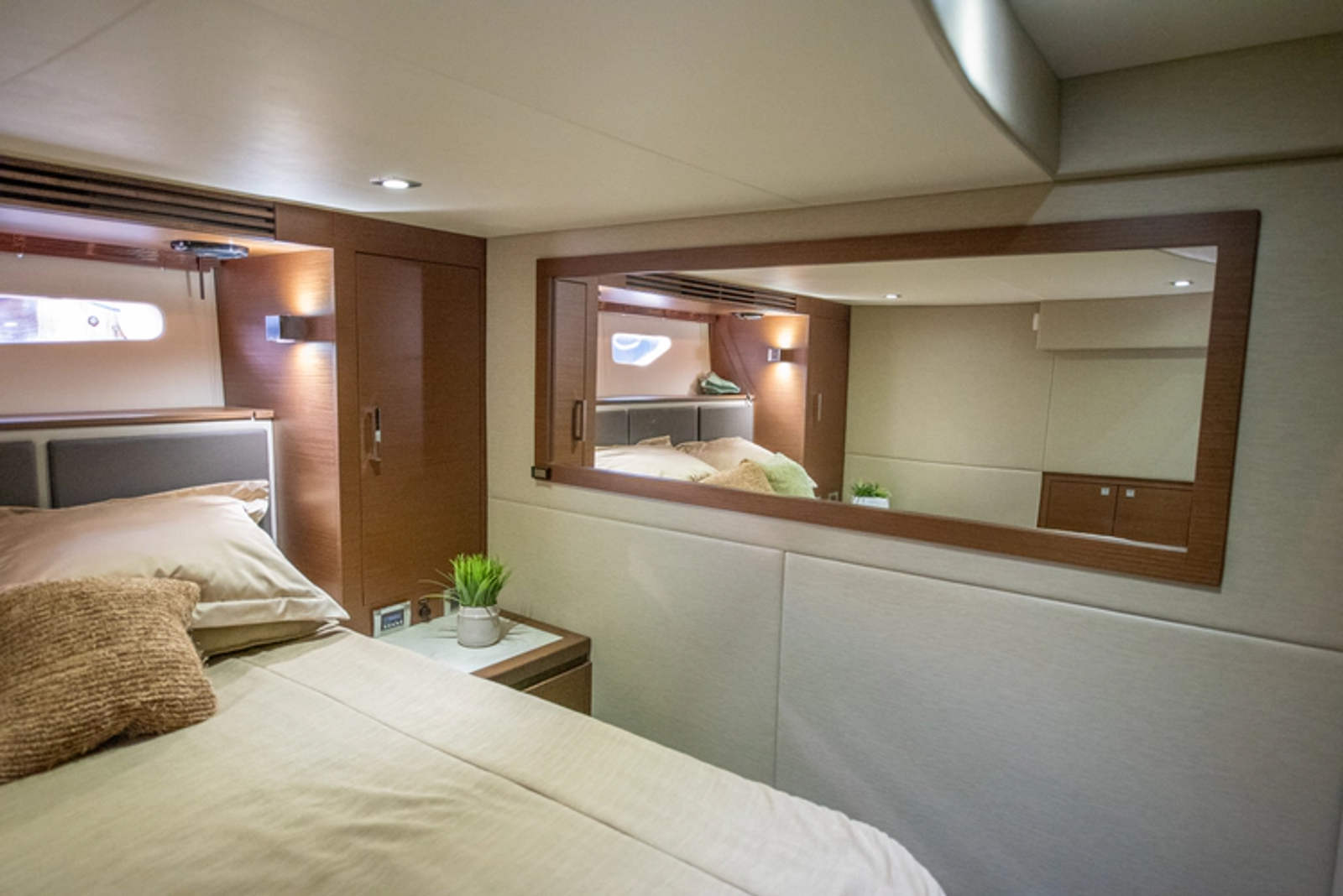 The forward VIP stateroom includes an electrically actuated bed, maximizing space and comfort while offering an ideal viewing angle for the mounted TV. Ensuite access to the day head provides full privacy.