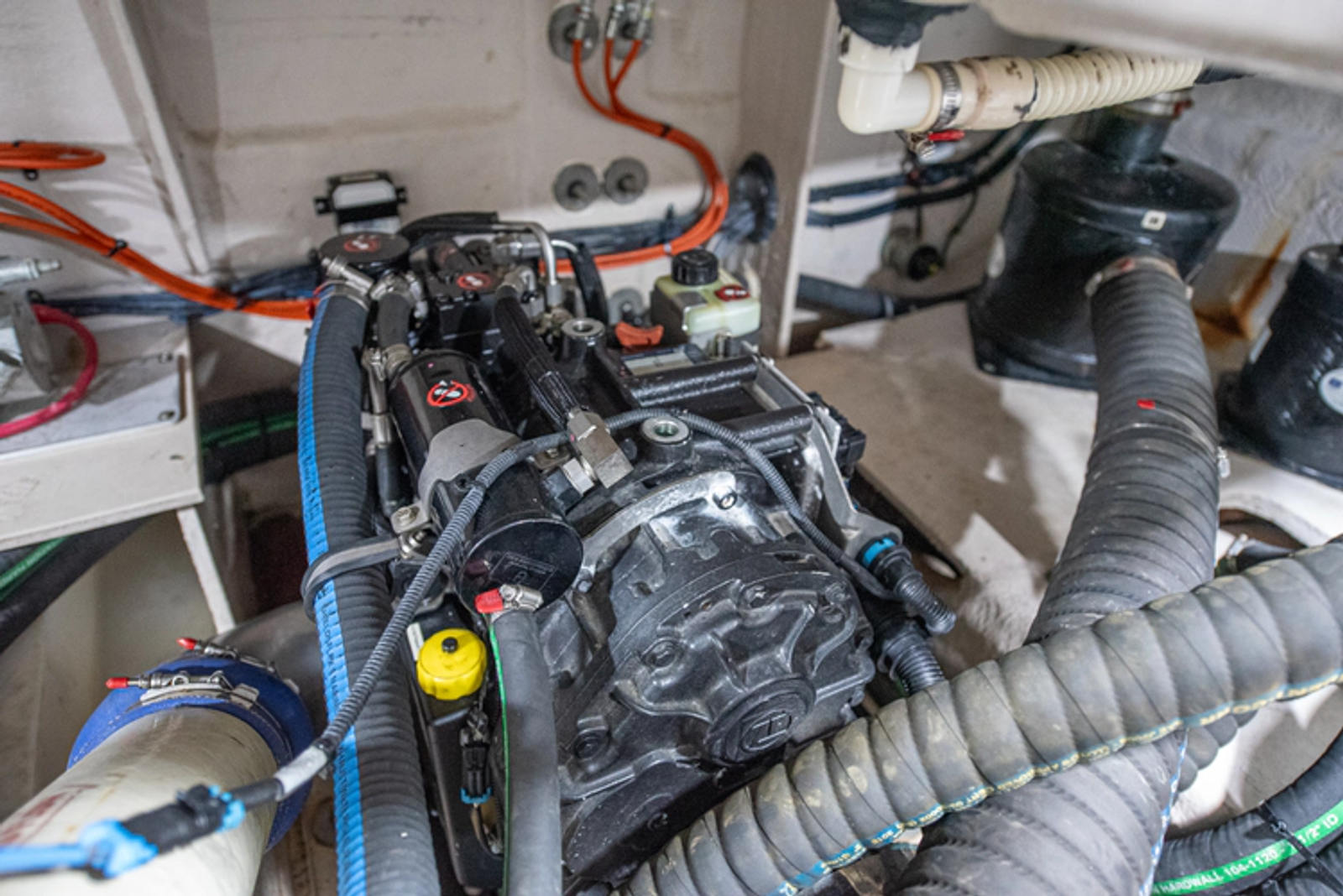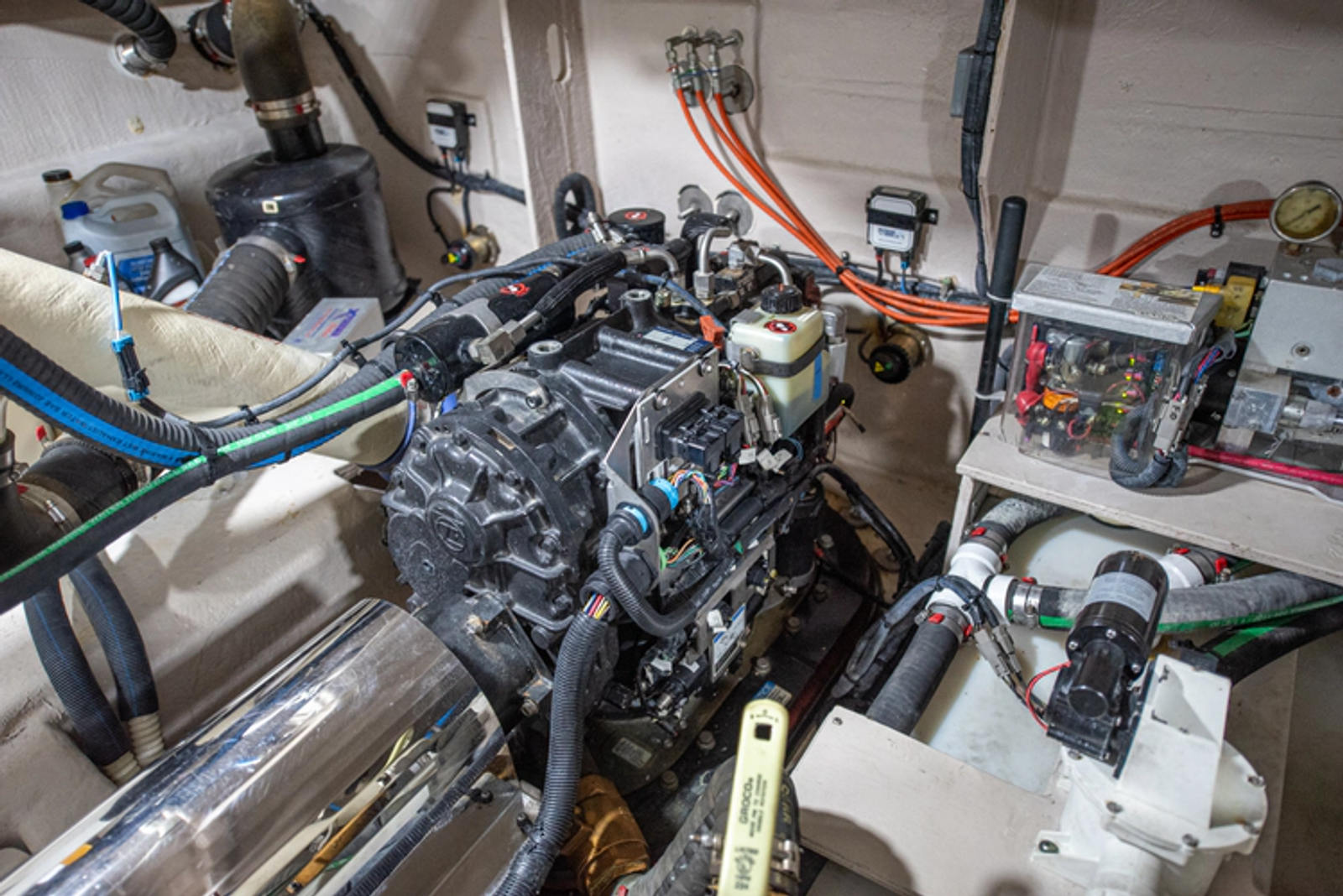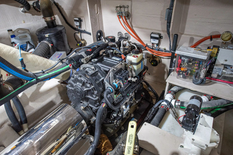 The engine room is impressively spacious for this class, with excellent access, organized plumbing, and user-friendly systems including an oil change system, battery management, and full DC breaker panel
