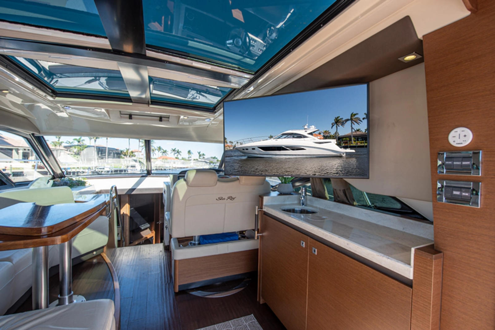 Sea Ray’s “Depart the Cave” design philosophy is executed exceptionally well on the 510 Sundancer, creating a bright, open, climate-controlled helm and salon that keeps you connected to the outdoors without the hassle of canvas.