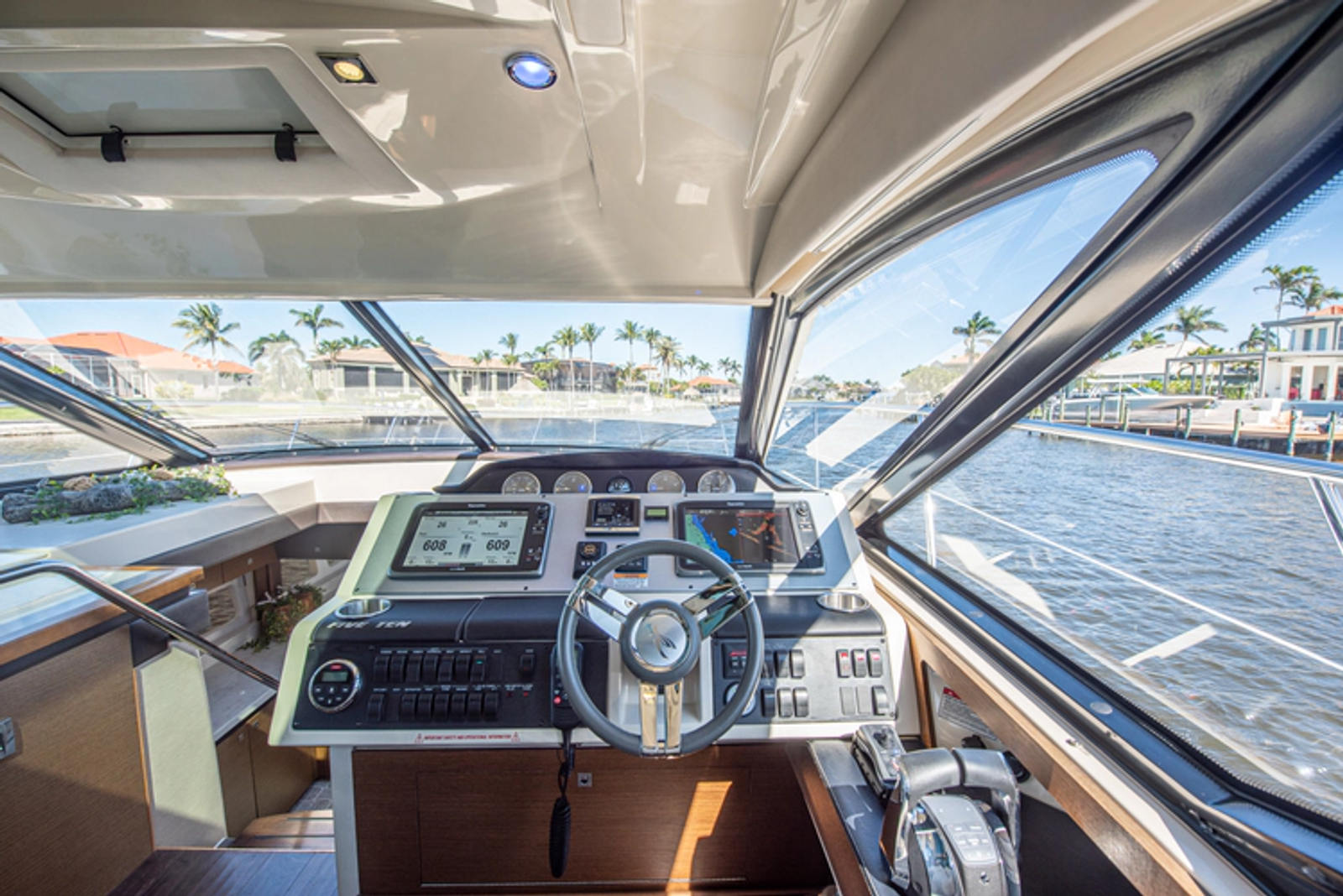 A double-wide helm seat swivels to face the port side sofa and allows for a small crowd to enjoy each others company in the upper salon. The helm features dual Raymarine chartplotters, digital engine information, redundant analog gauges, stereo control, switches, and a smooth shifting, digital throttle with docking joystick.