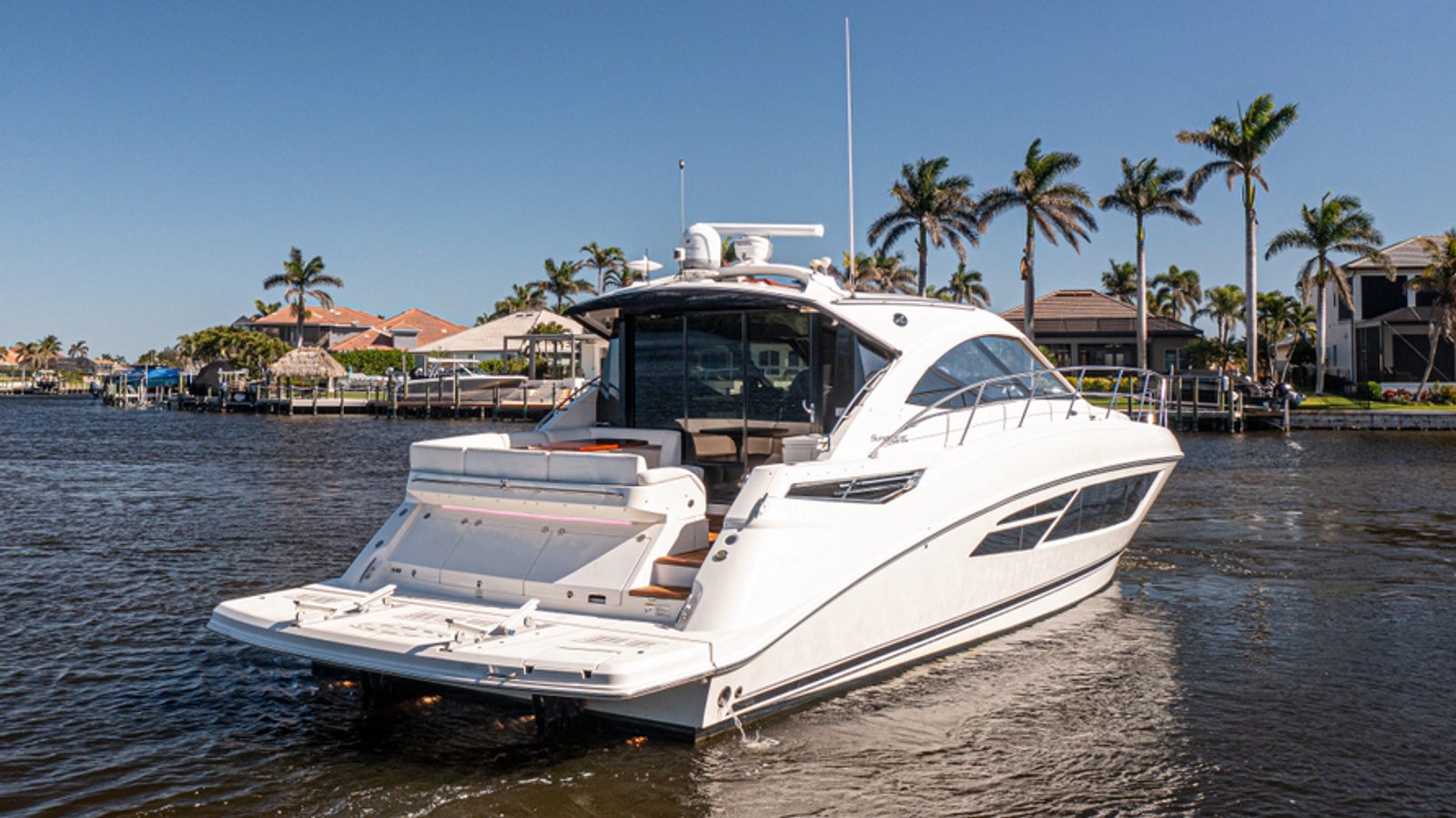 “Depart the cave” is a mantra builders have adapted when designing cabins of express cruisers, in an effort to give boaters the feel of being more connected with the outside, yet reduce downtime putting on/off canvas, and provide a climate controlled helm station. No boat mastered that philosophy better than the Sea Ray 510 Sundancer. Notable options and upgrades include: