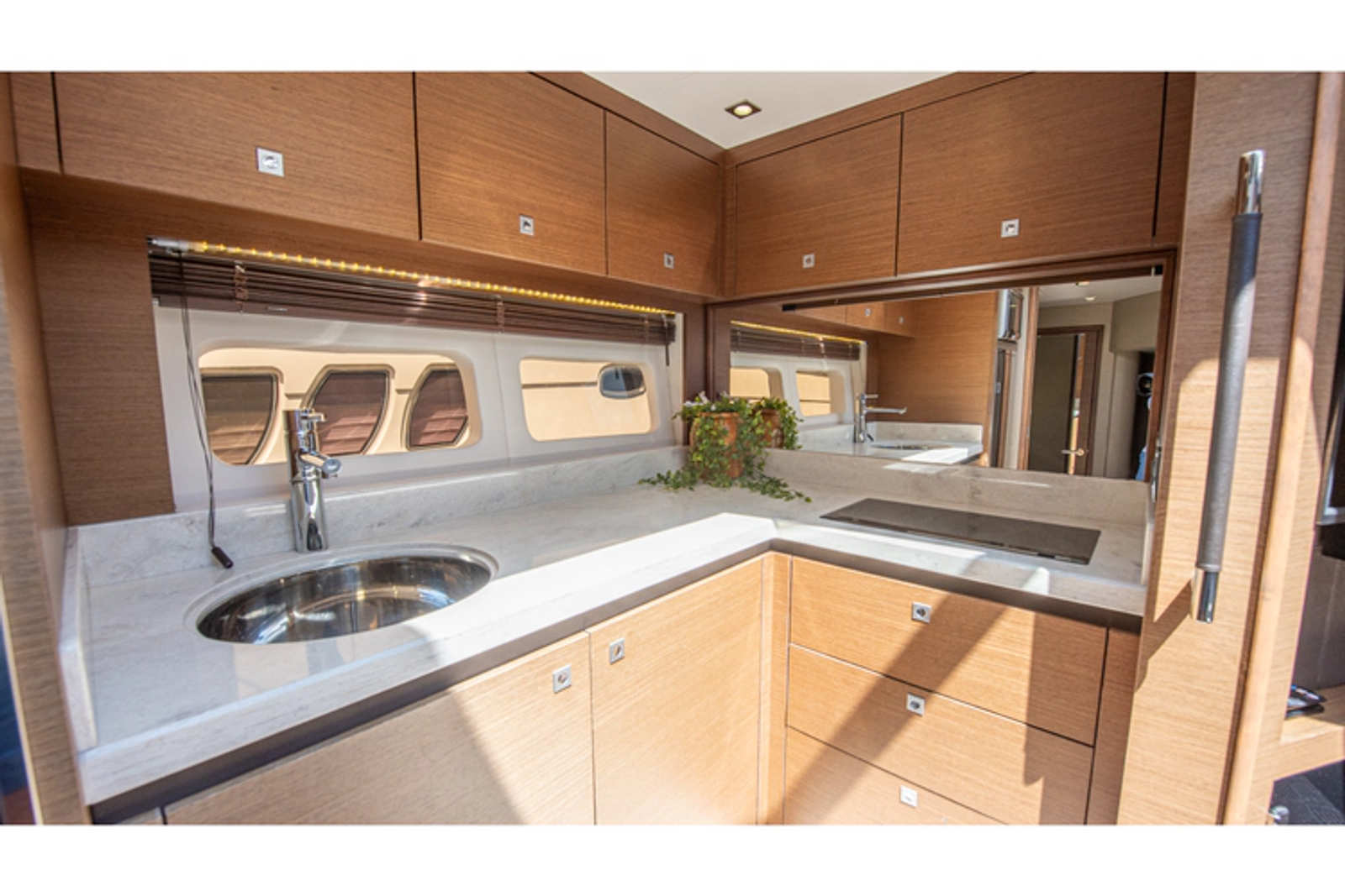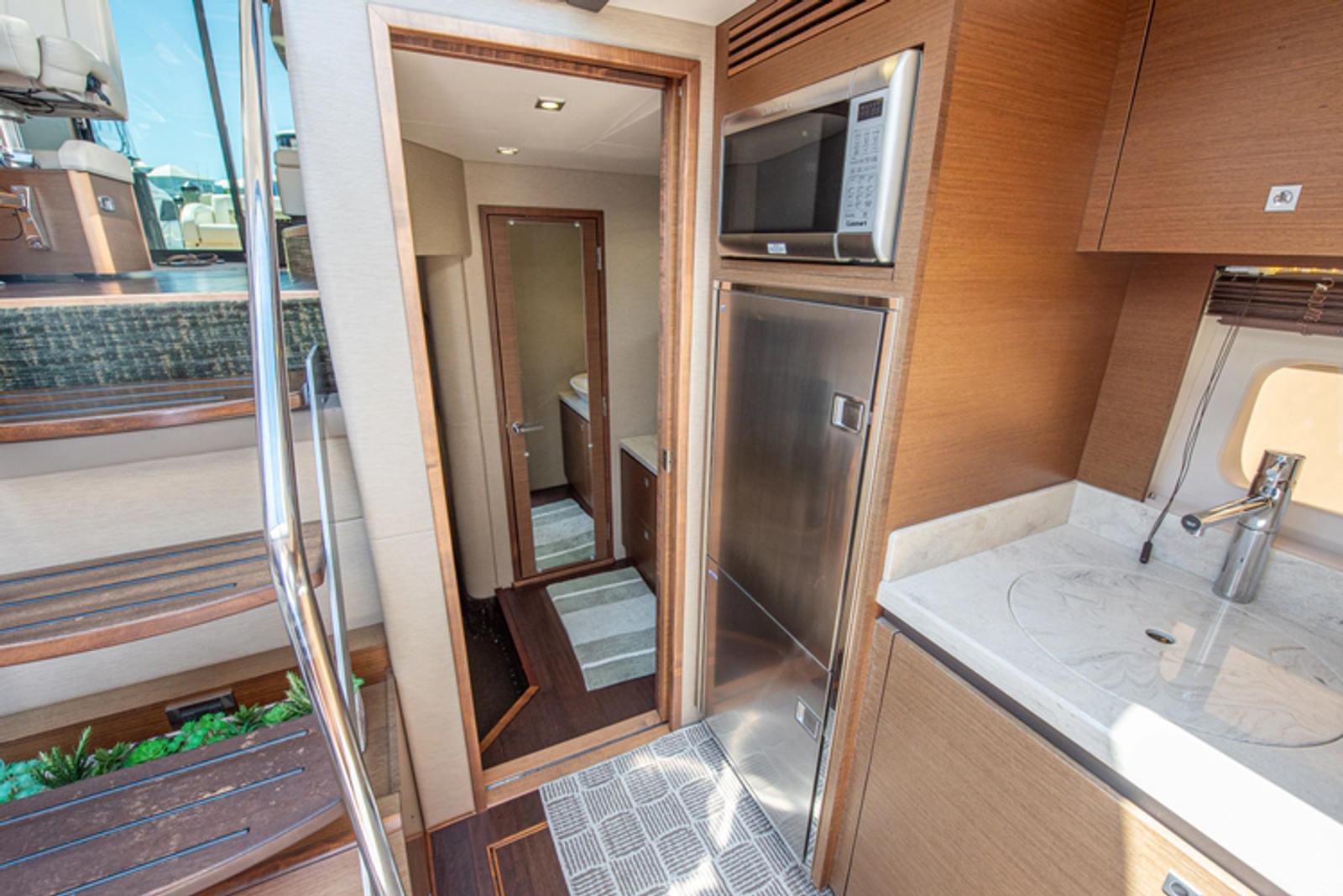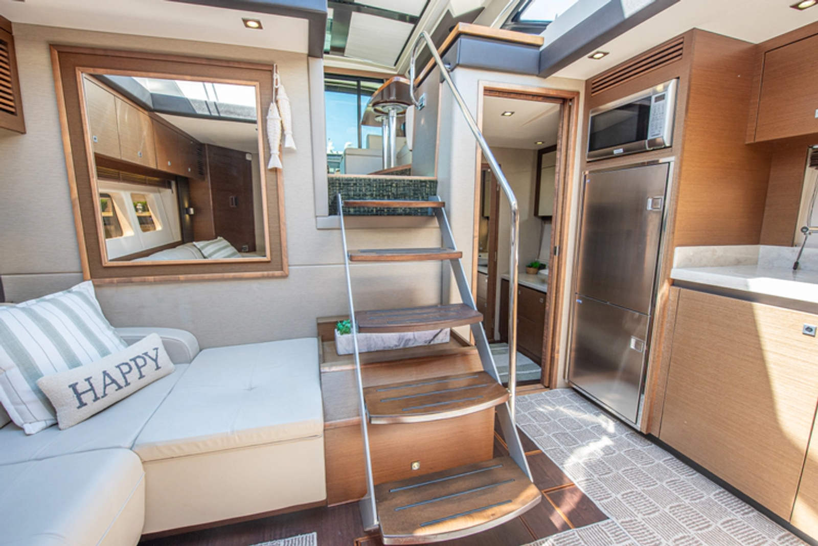 An atrium keeps the lower salon completely open and connected to the upper salon, which means those down below will not feel isolated and creates a living space that feels much larger than it truly is. A portside galley features a full size refrigerator and freezer, plenty of storage, microwave, corian countertop, and two burner stove.