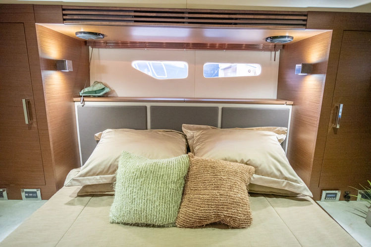 The aft master has a unique split vanity and head, which means one person can be getting ready to retire for the night or head out on the town, while the other is showering or using the head. A wide bed lifts to reveal immense storage underneath and sits opposite a large television with soundbar.