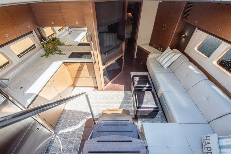 The sliding salon doors collapse to the port side to create a seamless entry from the cockpit to the upper salon. The upper salon features hardwood walnut floors which avoids the problem of tracking in dirt from the cockpit and are easy to keep clean. An ultraleather sofa to port sits on a raised floor which make provide for great companion visibility of the windshield and salon windows, either underway, or at rest.