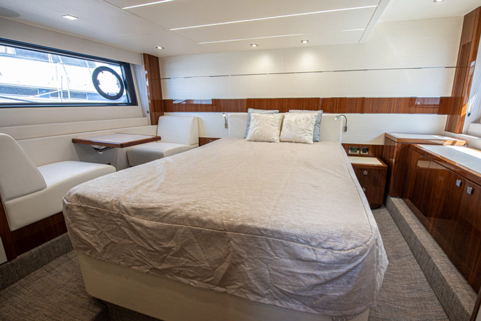 Below deck, the interior is finished in gloss walnut with upgraded soft goods and hardwood flooring, giving the space a clean and contemporary feel. The two-cabin layout is practical and comfortable, featuring a full-beam master stateroom and a forward VIP that can be configured as either a double berth or split into two separate beds, offering flexibility for guests. Both cabins are supported by well-appointed heads, and upgraded audio/visual systems are fitted throughout.
