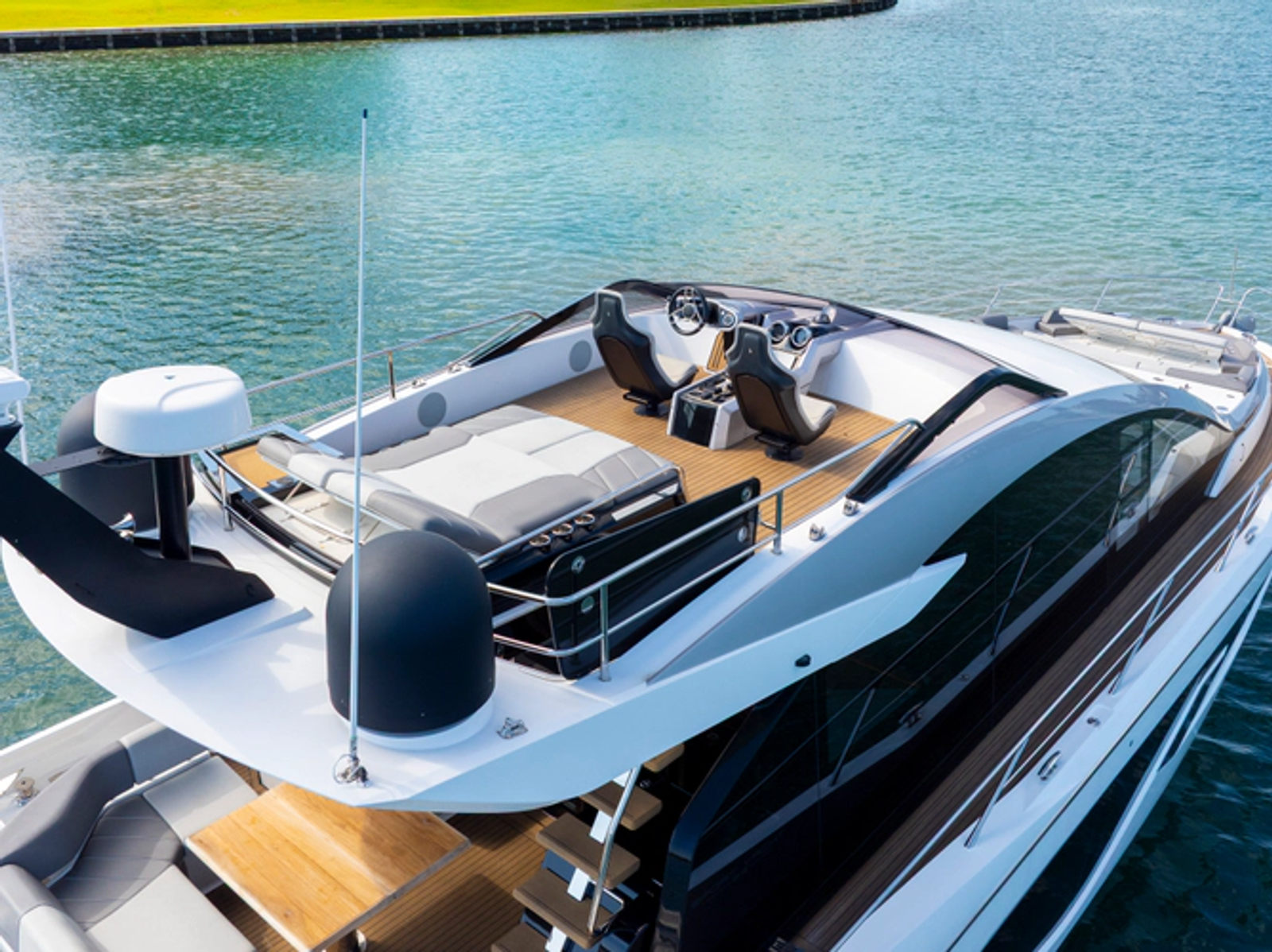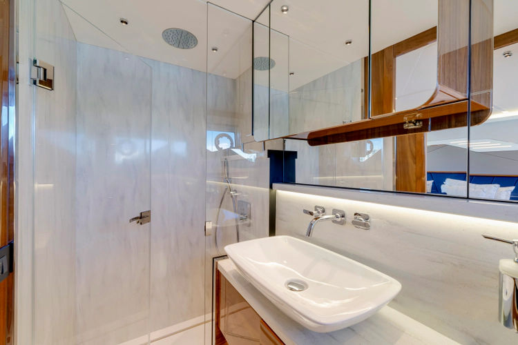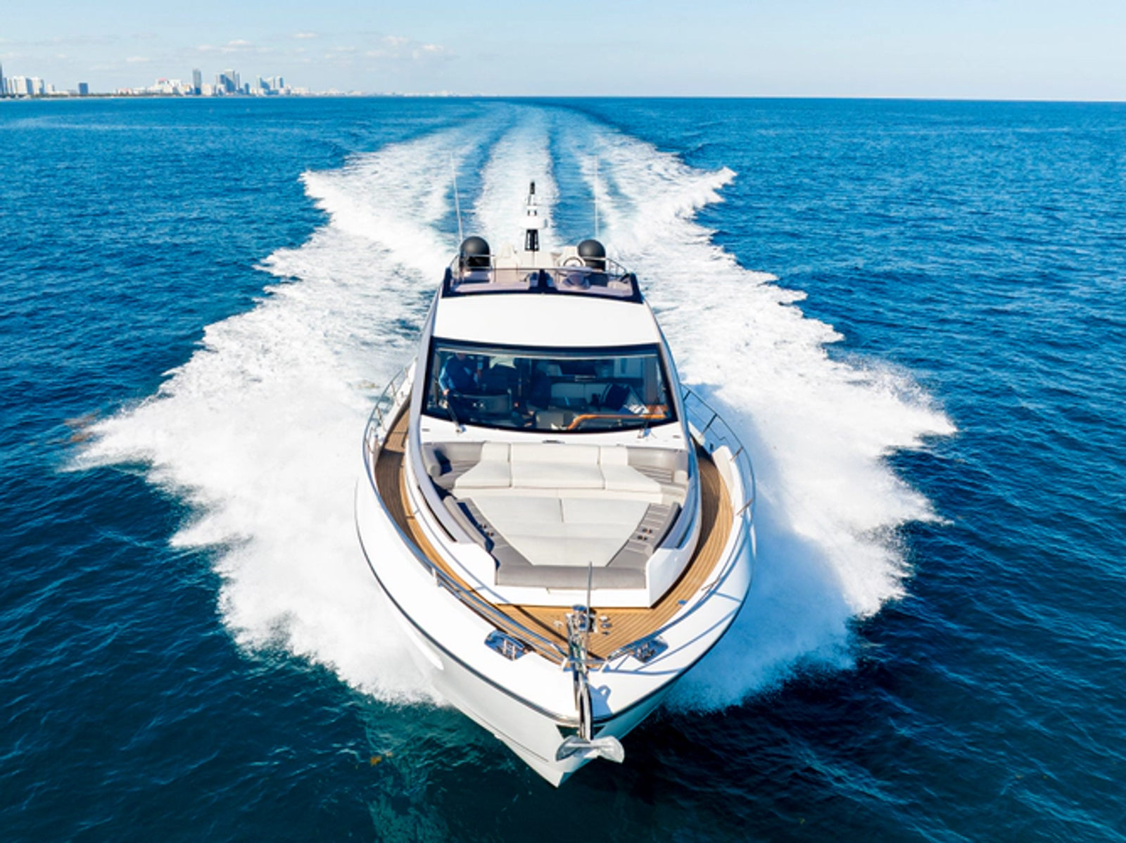 The 65 Sport Yacht combines cutting-edge innovation and luxury performance. Featuring the signature SkyHelm™ with adjustable IPS joystick controls, it offers a dynamic driving experience similar to a high-performance convertible. Its modular layout adapts for both socializing and adventure, including three spacious cabins for up to six guests and a forward crew cabin. Owners can transform the tender garage into a stylish Beach Club with sea access, seating and more. Reaching speeds of up to 35 knots, the 65 Sport Yacht delivers pure adrenaline and exceptional comfort on the water.