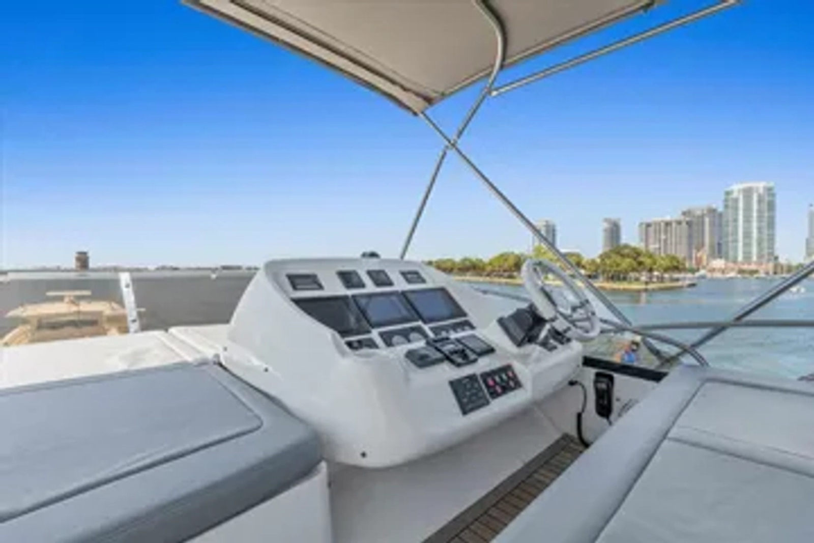 Cheers stands out with her painted hull, hydraulic swim platform, and custom dual helms fitted with triple Garmin plotters for effortless navigation. Bow and stern thrusters make docking smooth, while her custom extended flybridge Bimini, stainless-steel anchor, and included (never used) Isinglass enclosures make her ready for cruising in comfort.