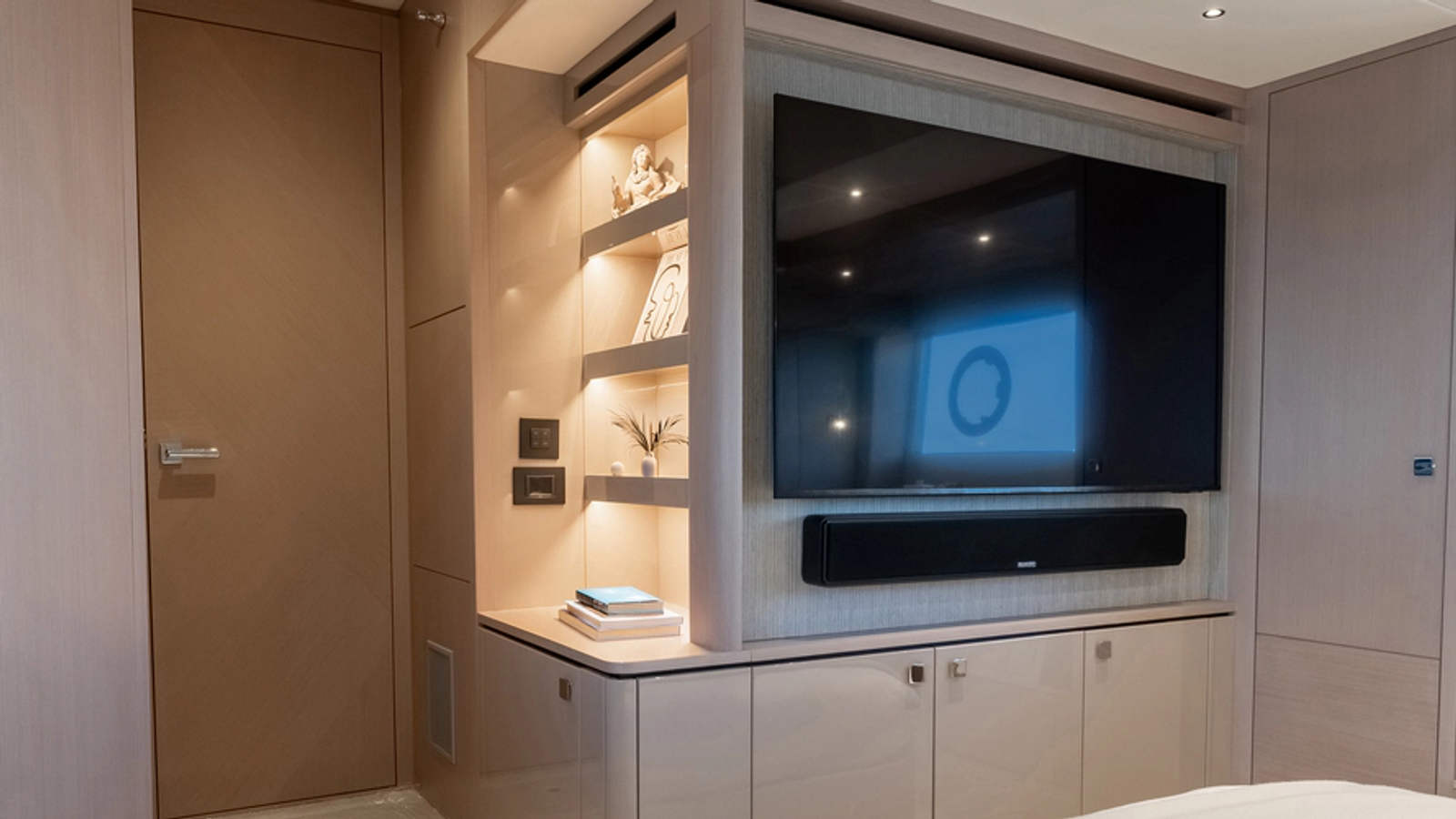 At the stern, the aft cockpit has been entirely transformed into a versatile, sociable setting. Innovative modular seating enables the space to shift seamlessly between dining area, relaxed lounge and expansive full-beam sunpad, offering impressive flexibility for entertaining or unwinding. The open-plan arrangement flows effortlessly to the swim platform and Beach Club, establishing an inviting waterside retreat.