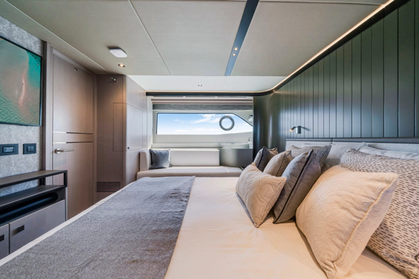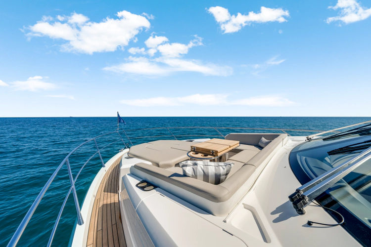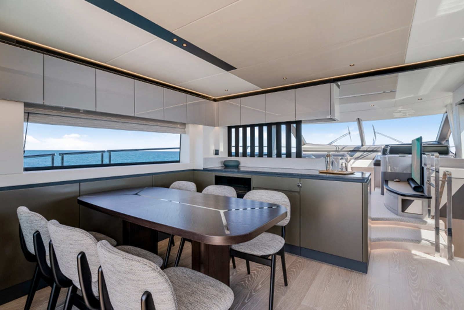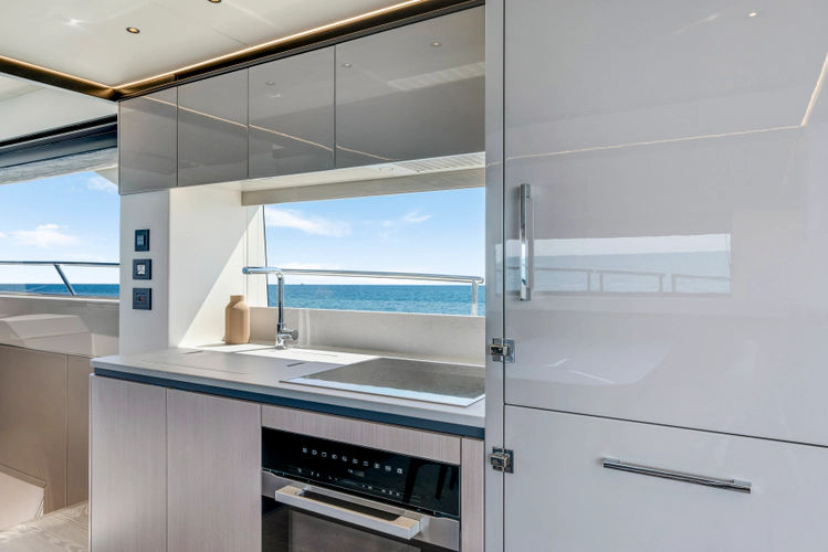 Throughout the main deck, there is a strong focus on creating generous, usable sociable spaces. The exterior lines flow effortlessly from the Portuguese-bridge bow seating and sunbathing areas to the expansive cockpit adjoining an innovative Beach Club with enhanced features, including a dedicated water level locker for two SeaBobs, delivering effortless enjoyment. Internally, the expansive main saloon benefits from sweeping glazing, extending below the TV console, revealing glimpses of the sea from all perspectives.