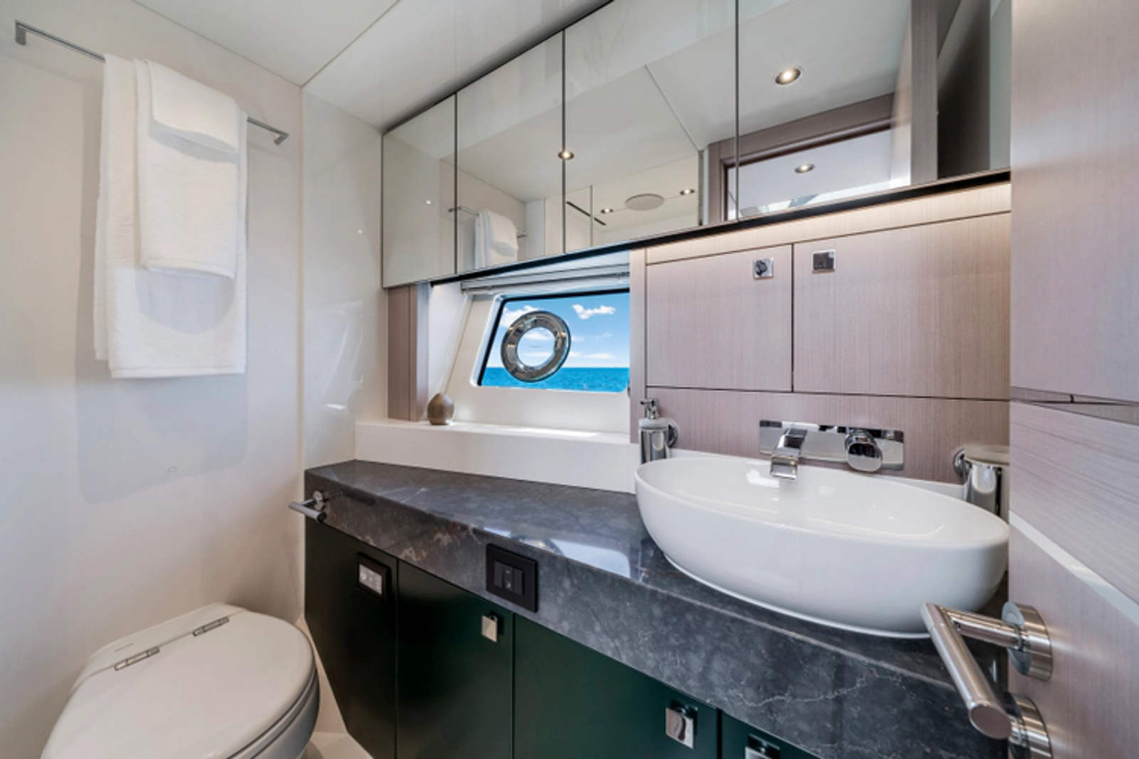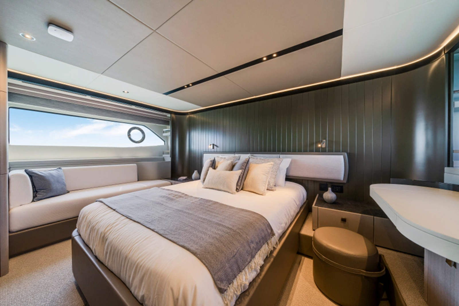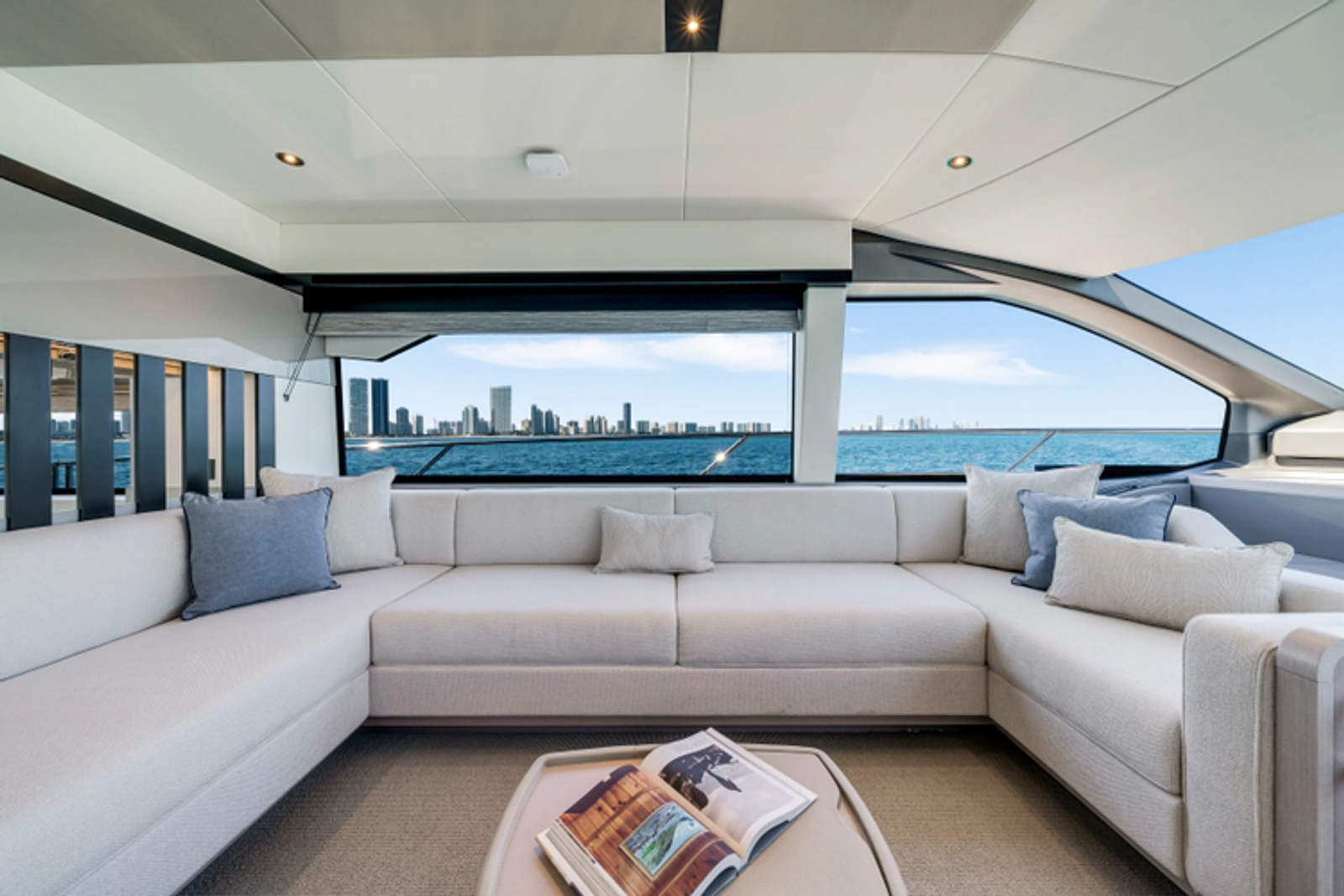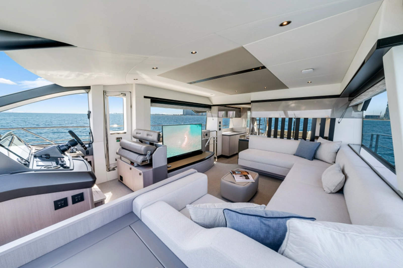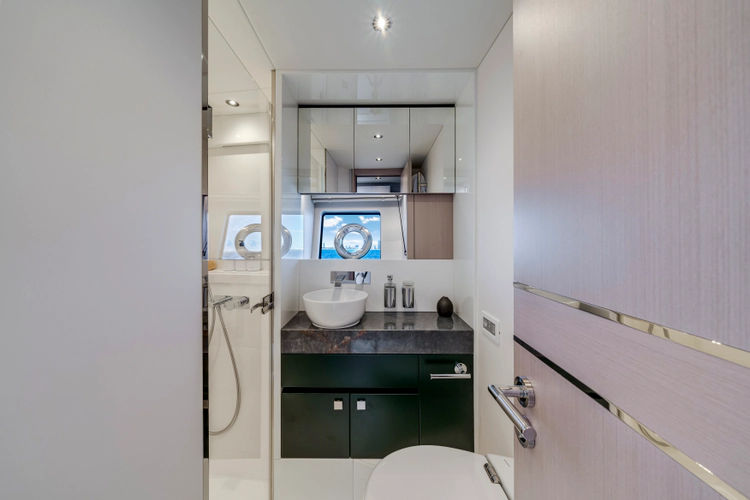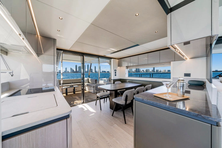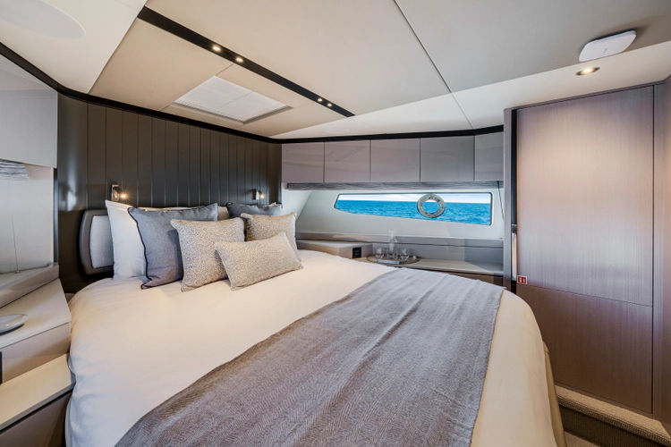 The fully-equipped aft galley with a large dinette links seamlessly to the cockpit via full-width sliding doors, helping to bring everyone together. The innovative design layout allows yachting owners to welcome guests with a strong focus on ambient lighting and interior detailing. Access to the spacious guest and master cabins is via the lower helm and elevated companion seating. The interiors boast exquisite attention to detail with a new palate of upholstery that provides a cool, crisp, and contemporary look, unmistakably a Manhattan.