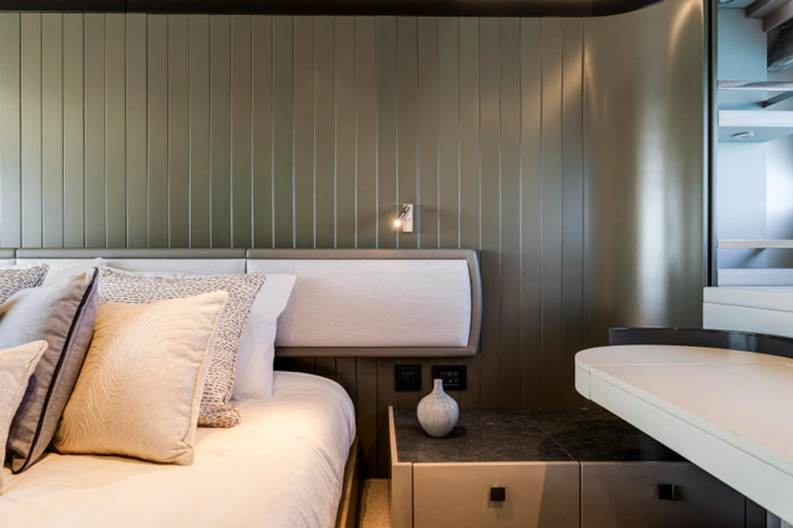 - Single staircase option providing access to all cabins. The staircase return to starboard creates a 4th Pullman cabin or the larger Master entrance and additional storage or appliance space. The saloon is enlarged with seating to starboard and a fall and rise TV outboard
