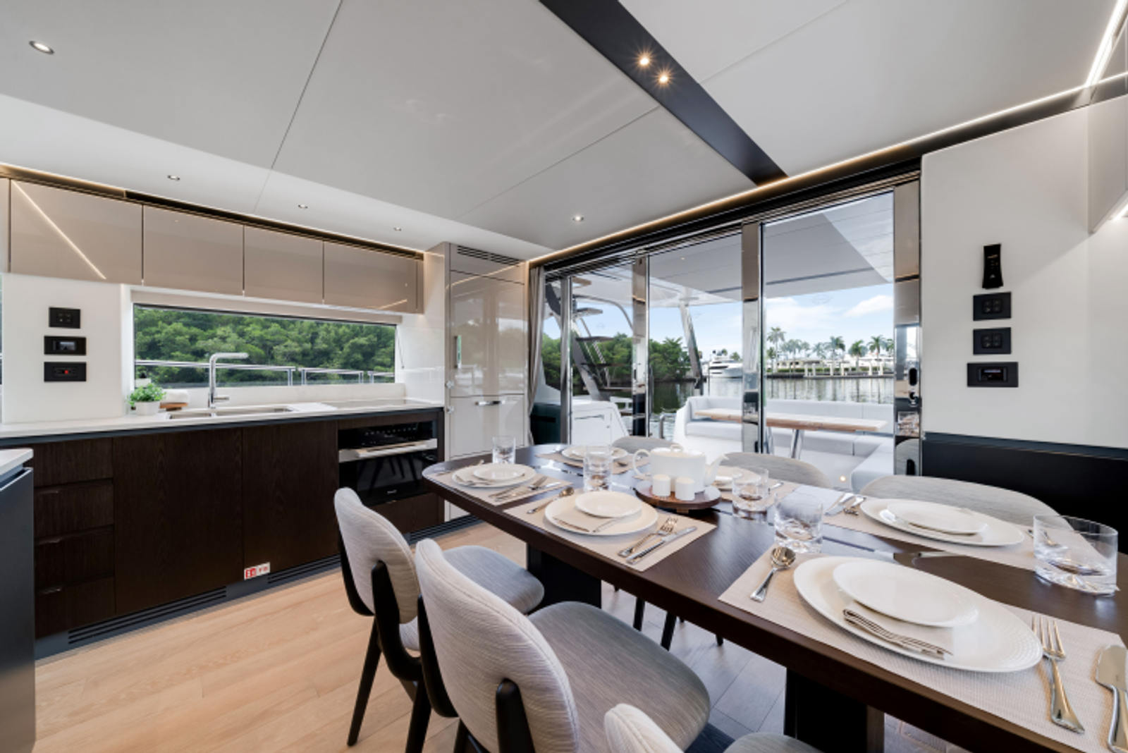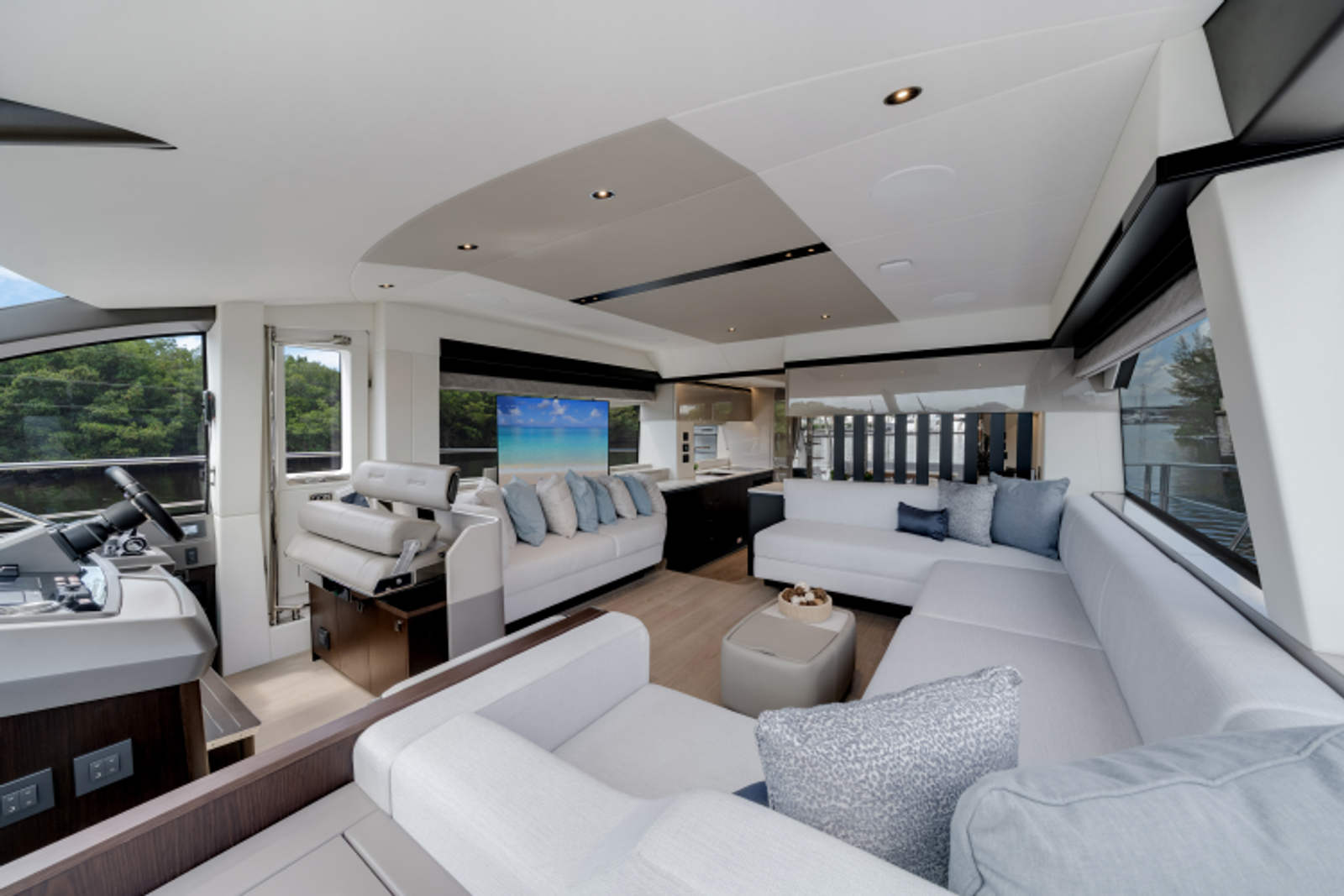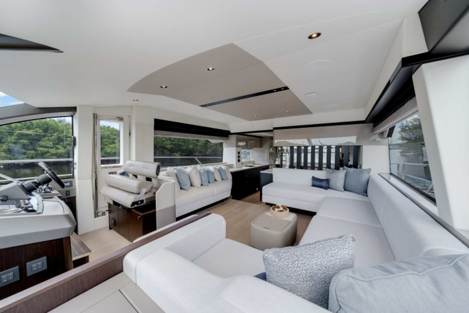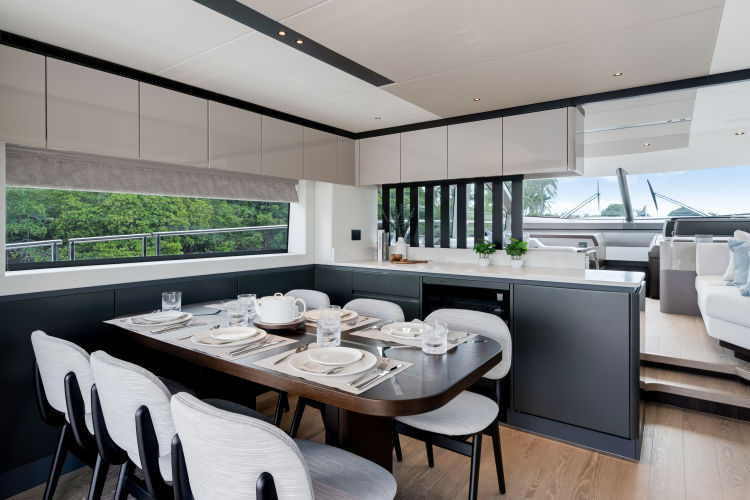 The fully-equipped aft galley with a large dinette links seamlessly to the cockpit via full-width sliding doors, helping to bring everyone together. The innovative design layout allows yachting owners to welcome guests with a strong focus on ambient lighting and interior detailing. Access to the spacious guest and master cabins is via the lower helm and elevated companion seating. The interiors boast exquisite attention to detail with a new palate of upholstery that provides a cool, crisp, and contemporary look, unmistakably a Manhattan.