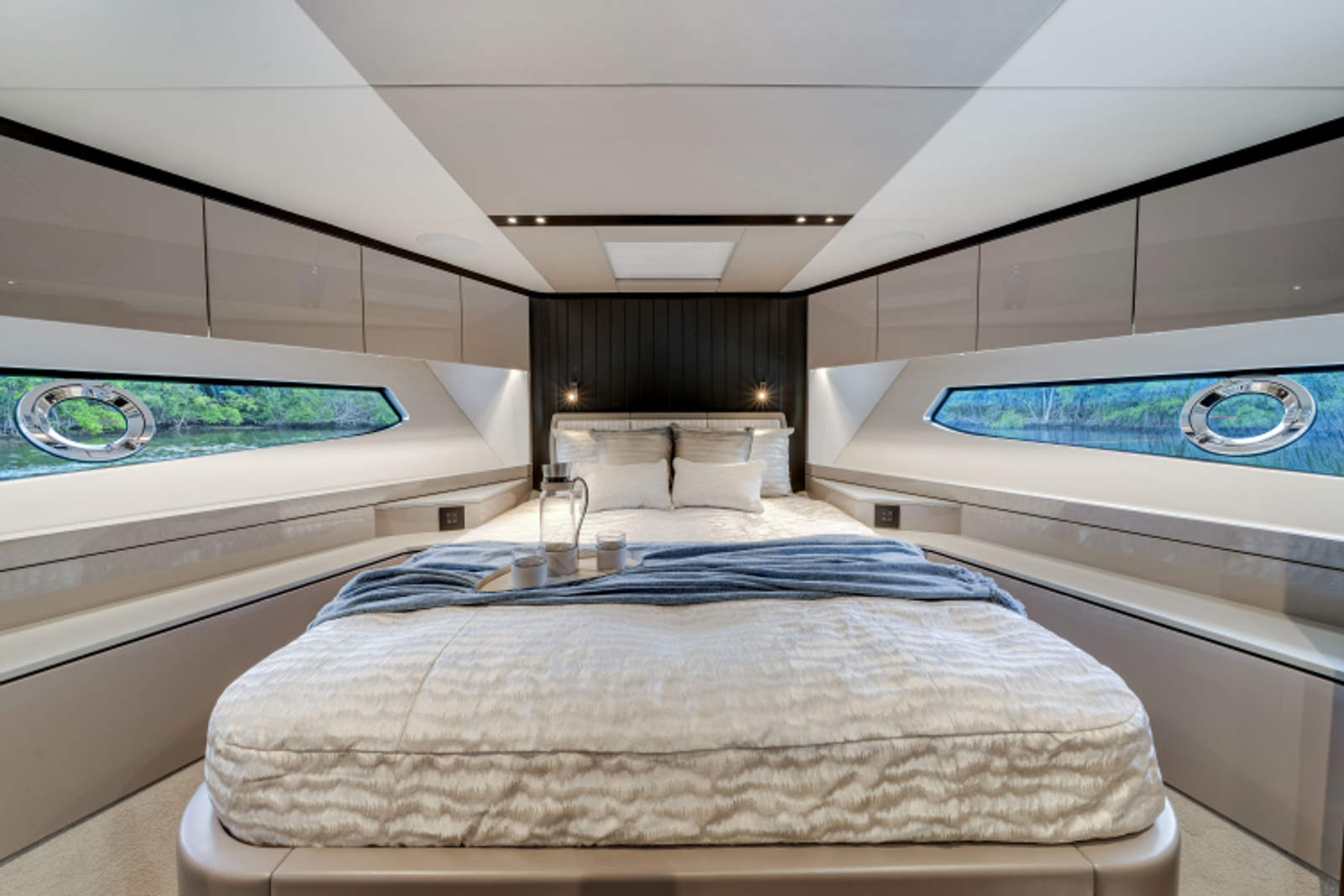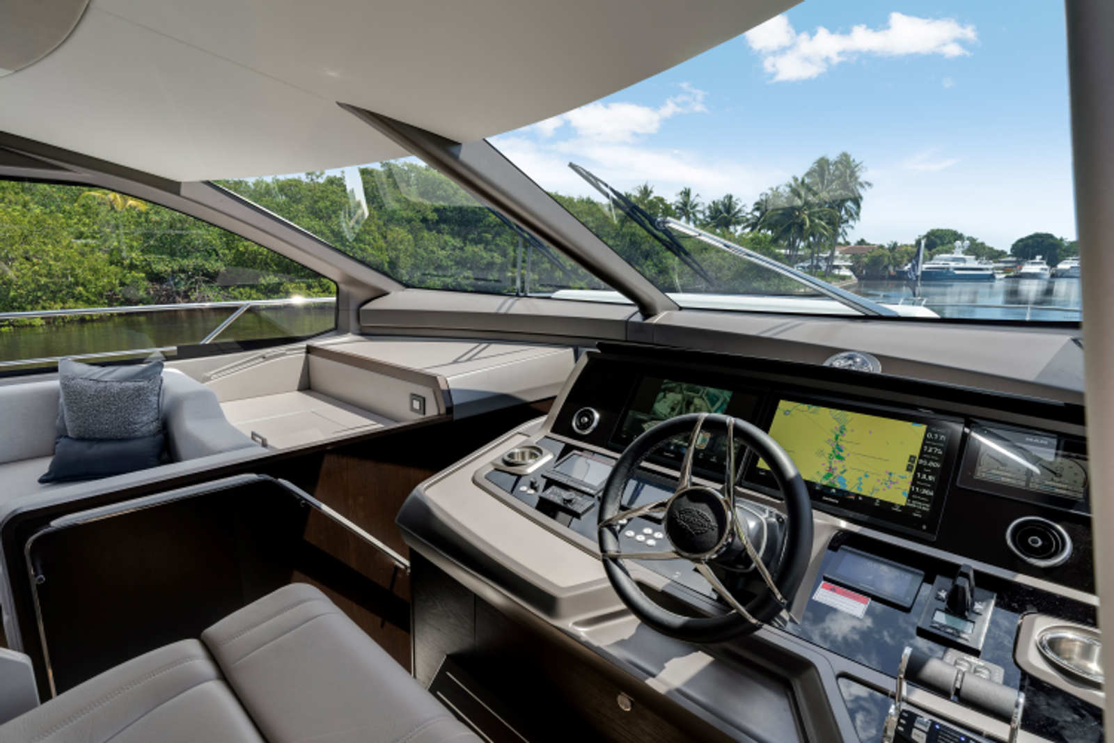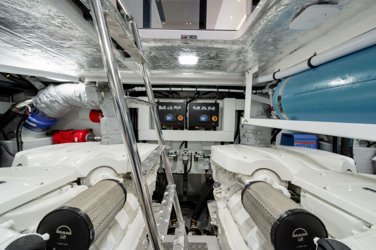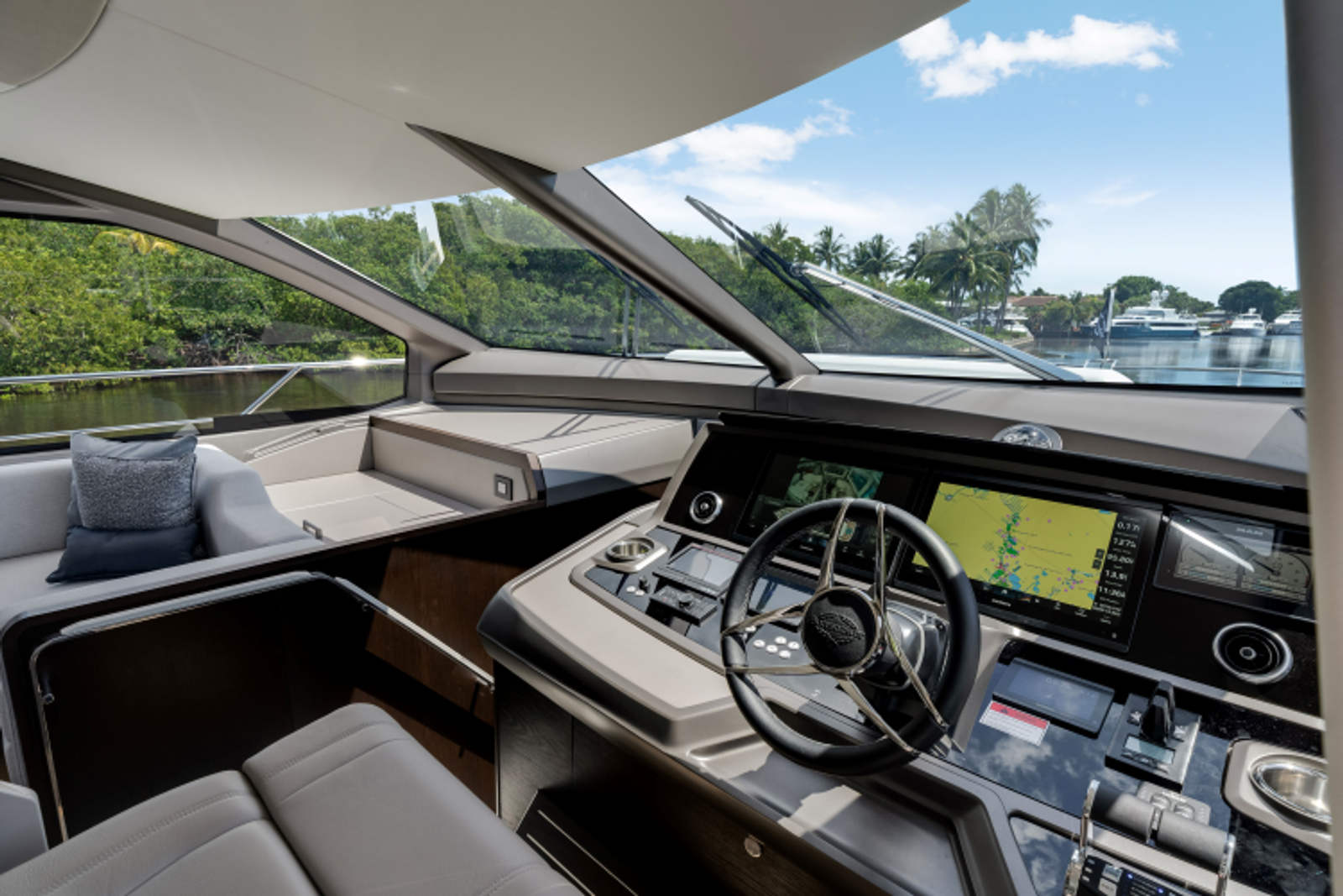 The fully-equipped aft galley with a large dinette links seamlessly to the cockpit via full-width sliding doors, helping to bring everyone together. The innovative design layout allows yachting owners to welcome guests with a strong focus on ambient lighting and interior detailing. Access to the spacious guest and master cabins is via the lower helm and elevated companion seating. The interiors boast exquisite attention to detail with a new palate of upholstery that provides a cool, crisp, and contemporary look, unmistakably a Manhattan.