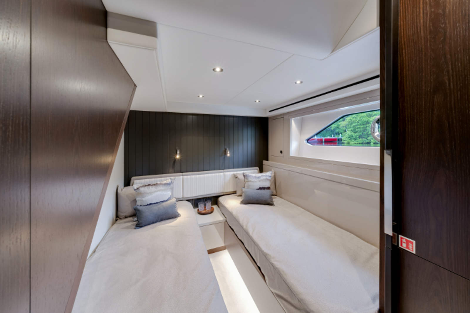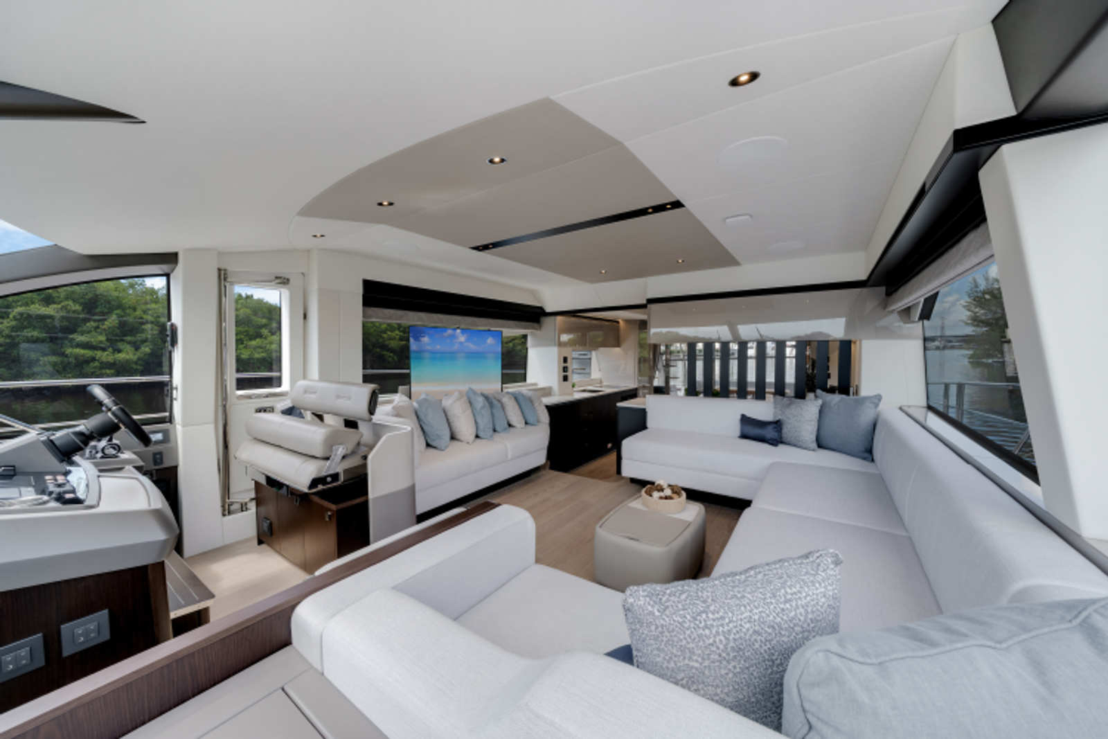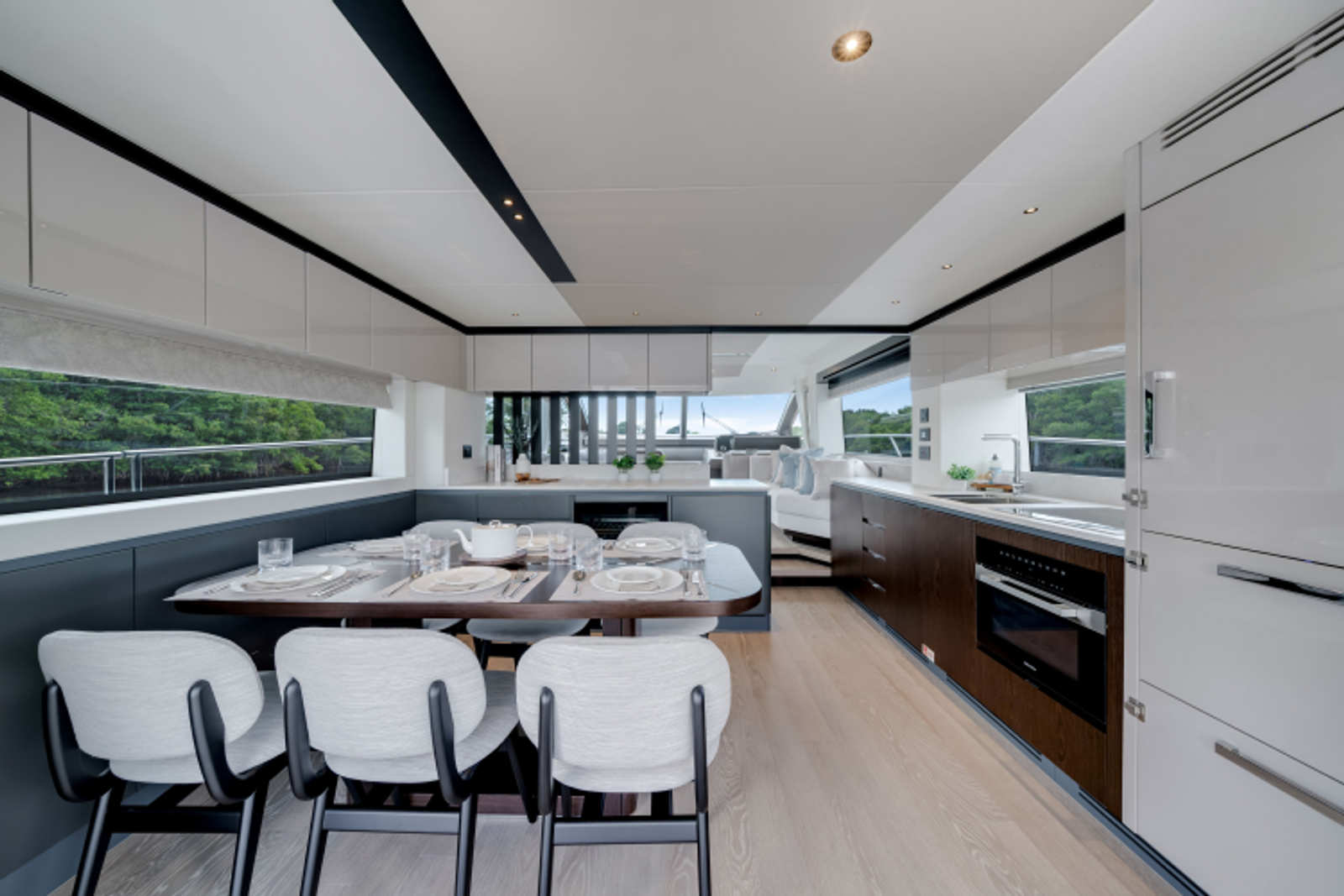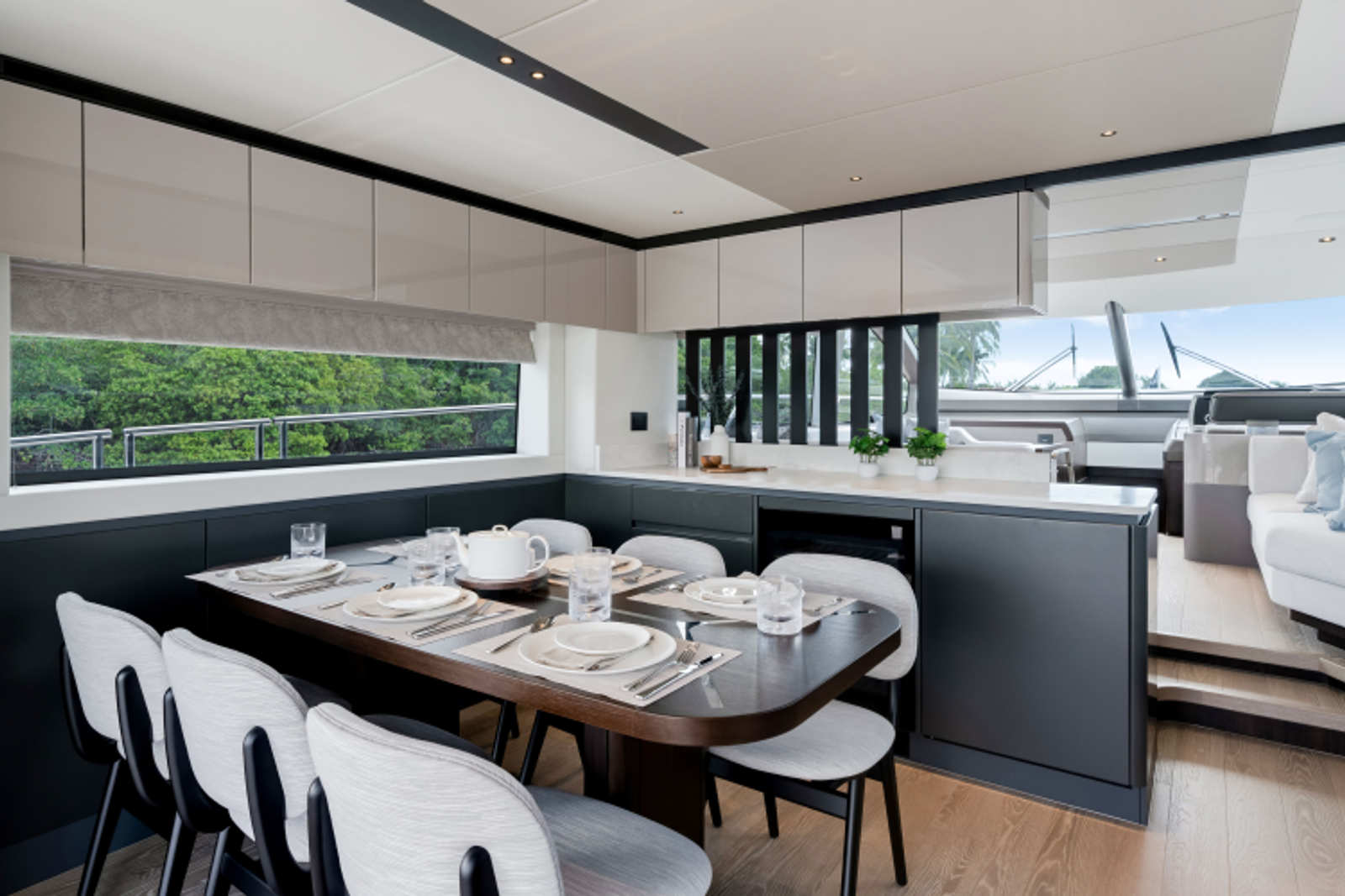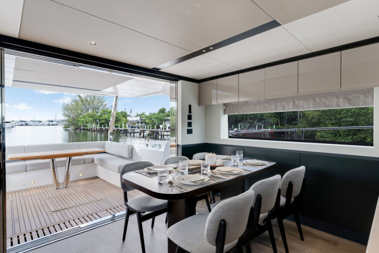 Throughout the main deck, there is a strong focus on creating generous, usable sociable spaces. The exterior lines flow effortlessly from the Portuguese-bridge bow seating and sunbathing areas to the expansive cockpit adjoining an innovative Beach Club with enhanced features, including a dedicated water level locker for two SeaBobs, delivering effortless enjoyment. Internally, the expansive main saloon benefits from sweeping glazing, extending below the TV console, revealing glimpses of the sea from all perspectives.