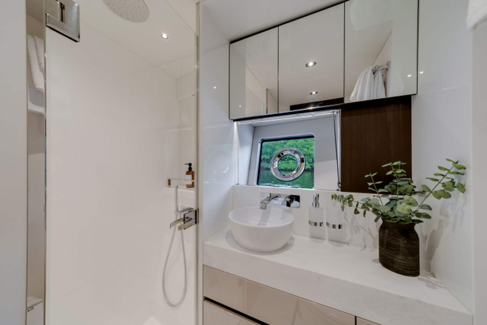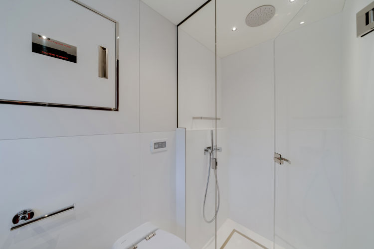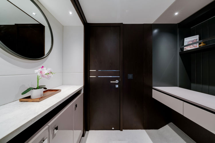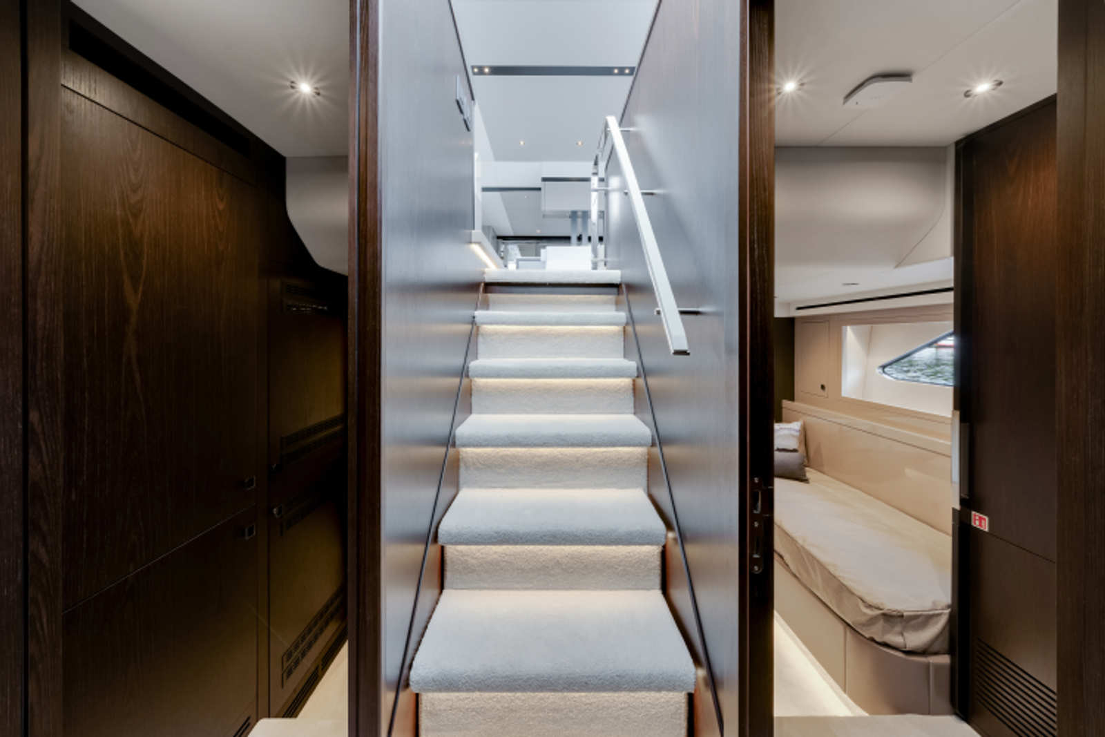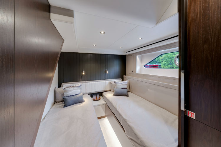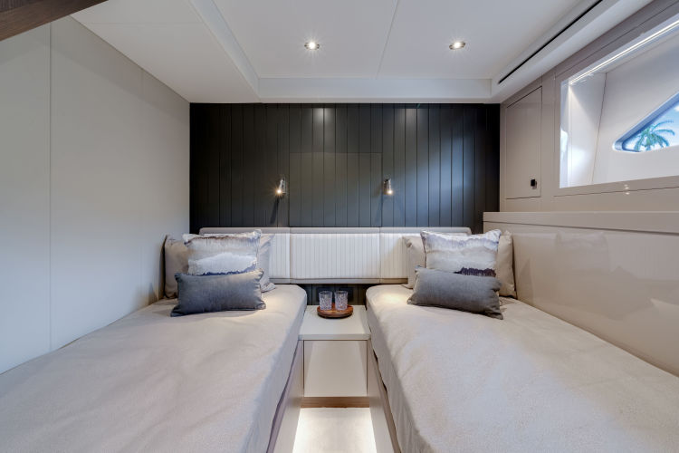 - Single staircase option providing access to all cabins. The staircase return to starboard creates a 4th Pullman cabin or the larger Master entrance. The saloon is enlarged with seating to starboard and a fall and rise TV outboard