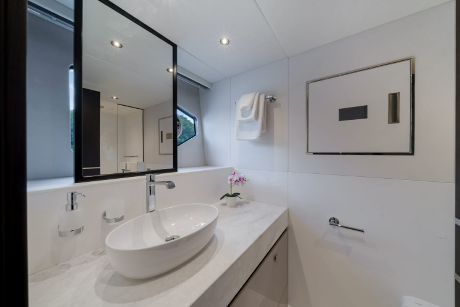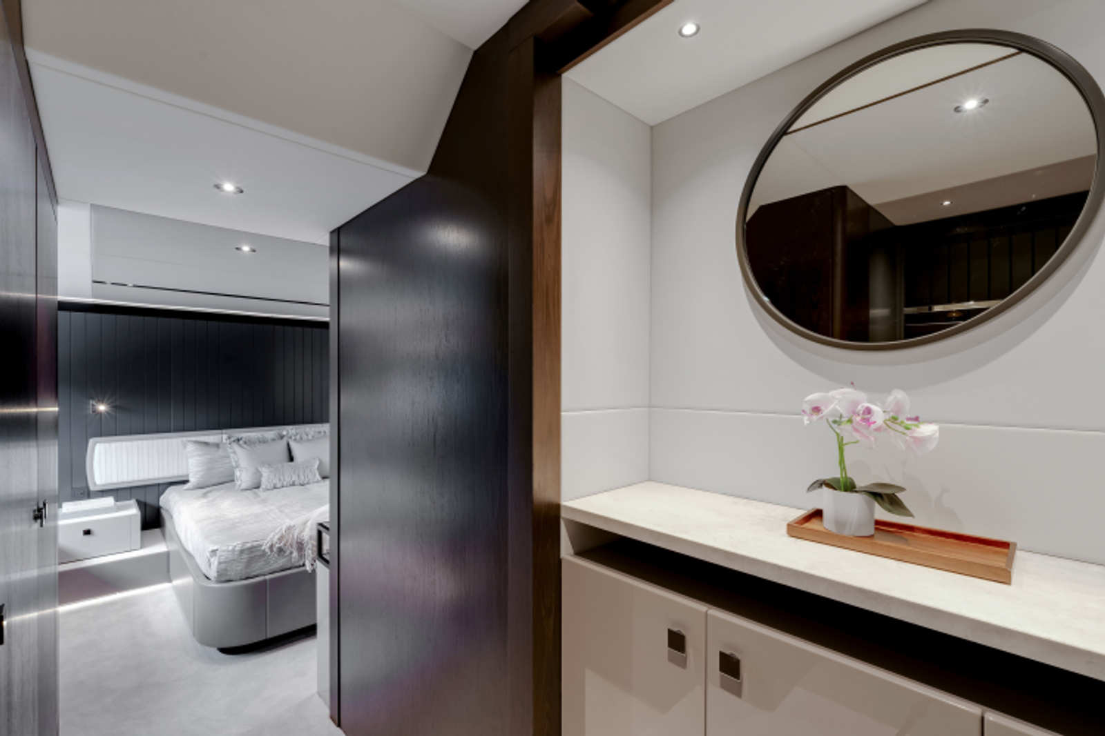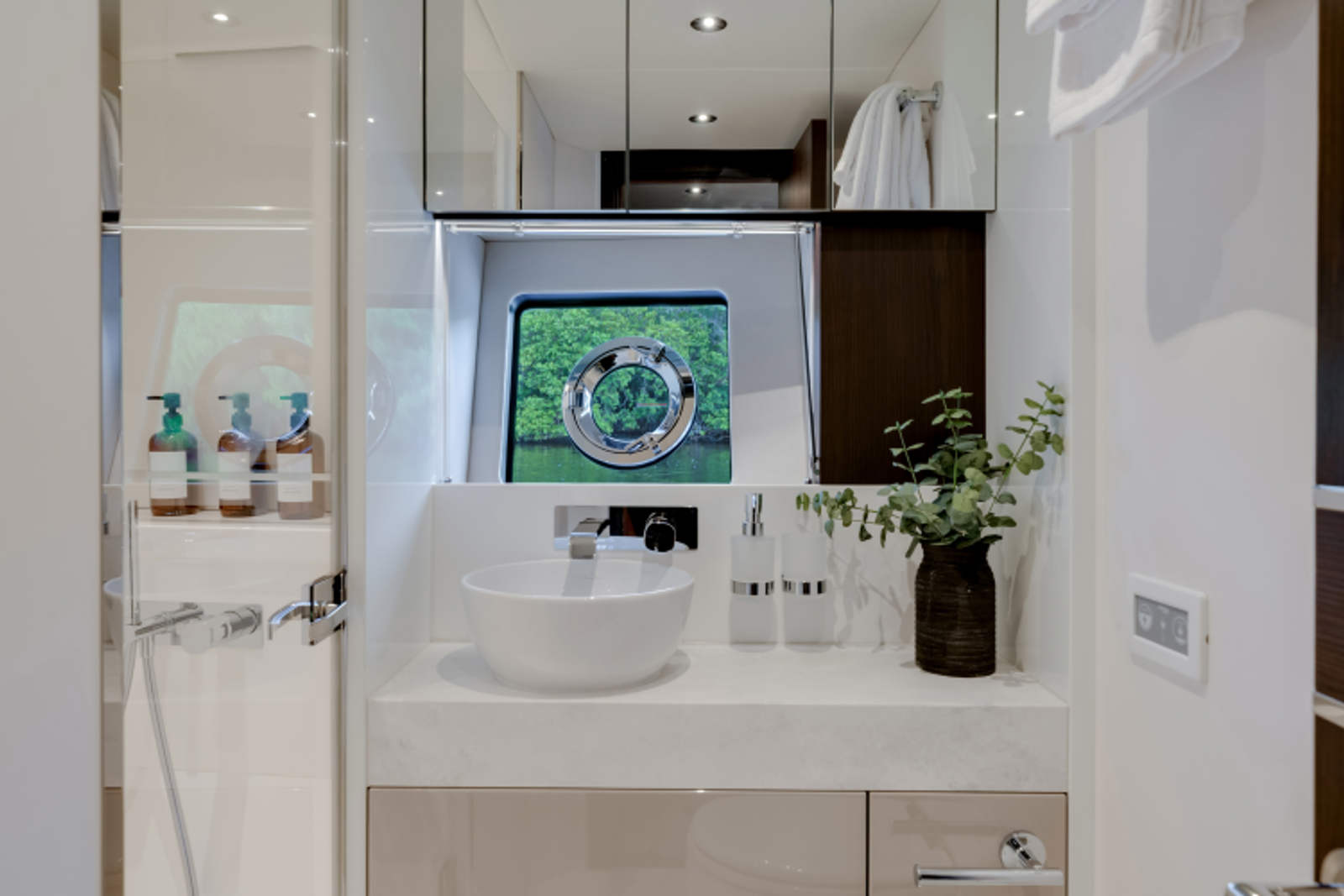 - Single staircase option providing access to all cabins. The staircase return to starboard creates a 4th Pullman cabin or the larger Master entrance. The saloon is enlarged with seating to starboard and a fall and rise TV outboard
