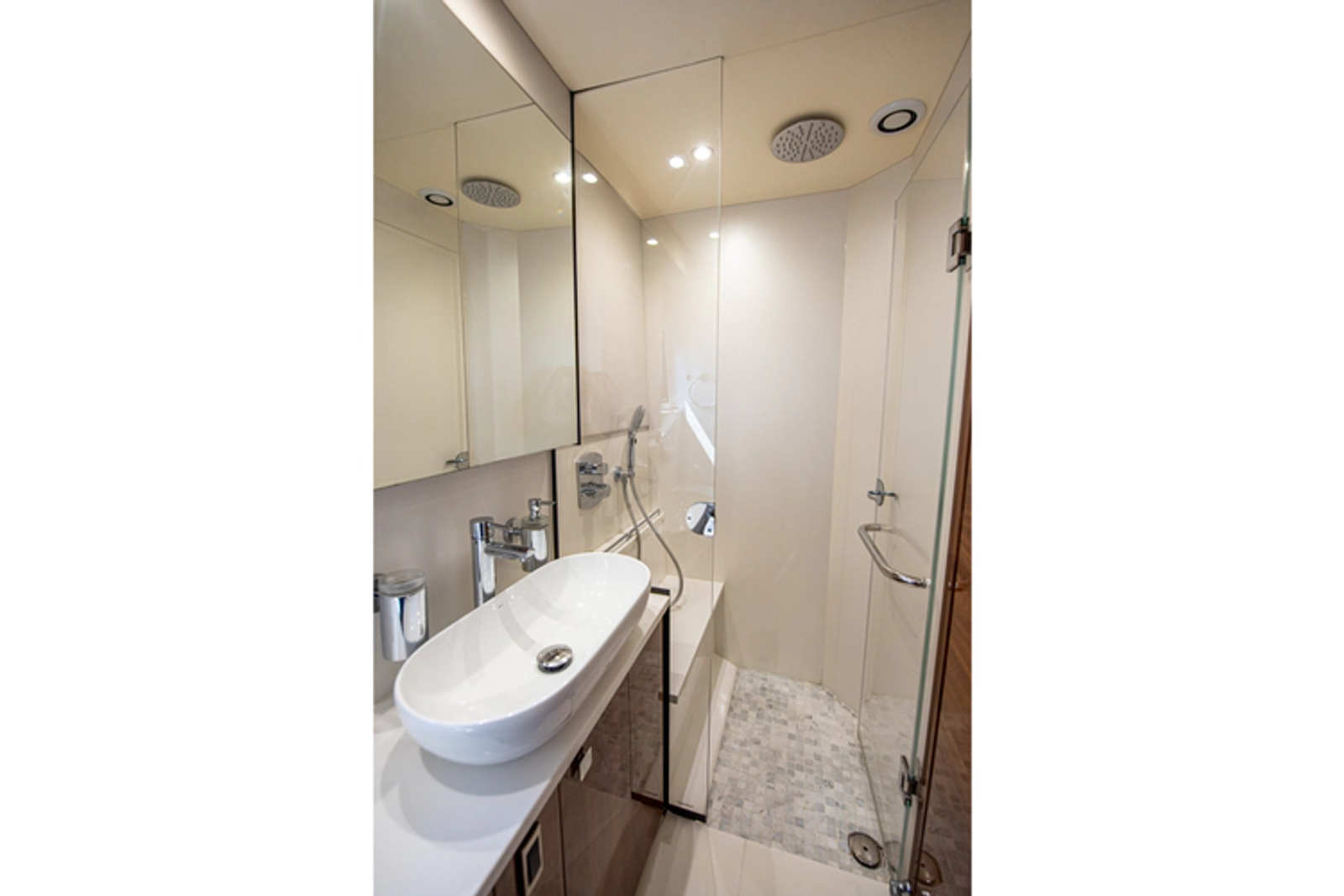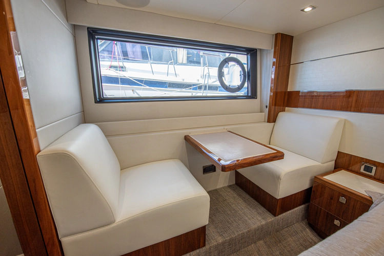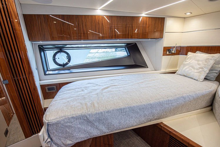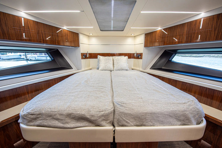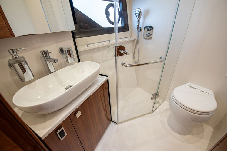 Below deck, the interior is finished in gloss walnut with upgraded soft goods and hardwood flooring, giving the space a clean and contemporary feel. The two-cabin layout is practical and comfortable, featuring a full-beam master stateroom and a forward VIP that can be configured as either a double berth or split into two separate beds, offering flexibility for guests. Both cabins are supported by well-appointed heads, and upgraded audio/visual systems are fitted throughout.