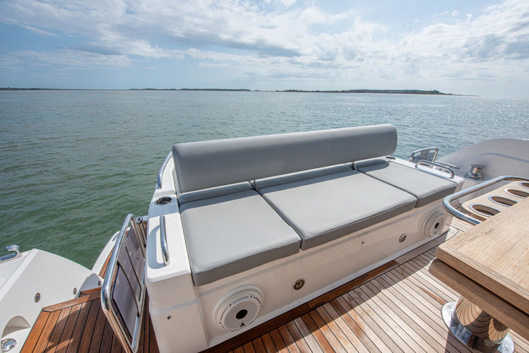 - Fold-down transom seatingForedeck sunpad with adjustable backrests