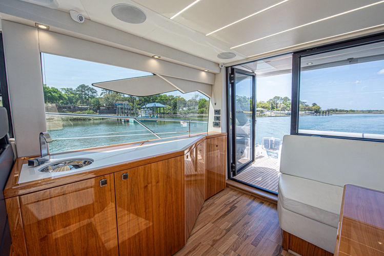 - Beach club-style drop-down transom with grill, seating, and lighting