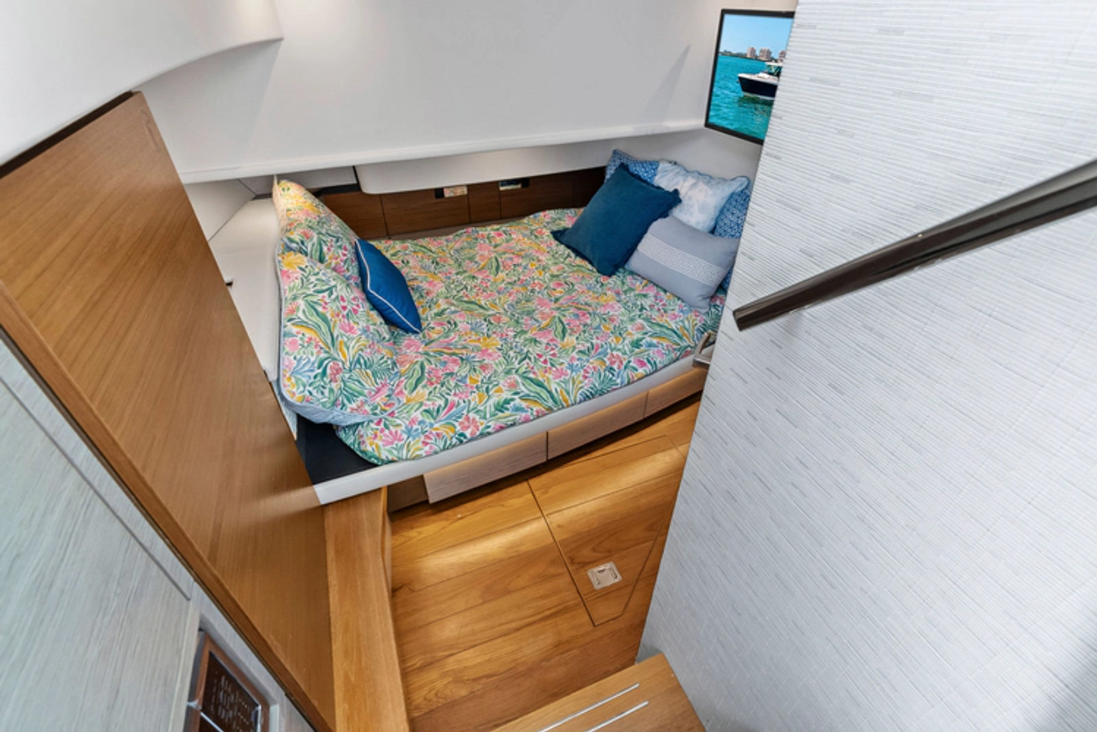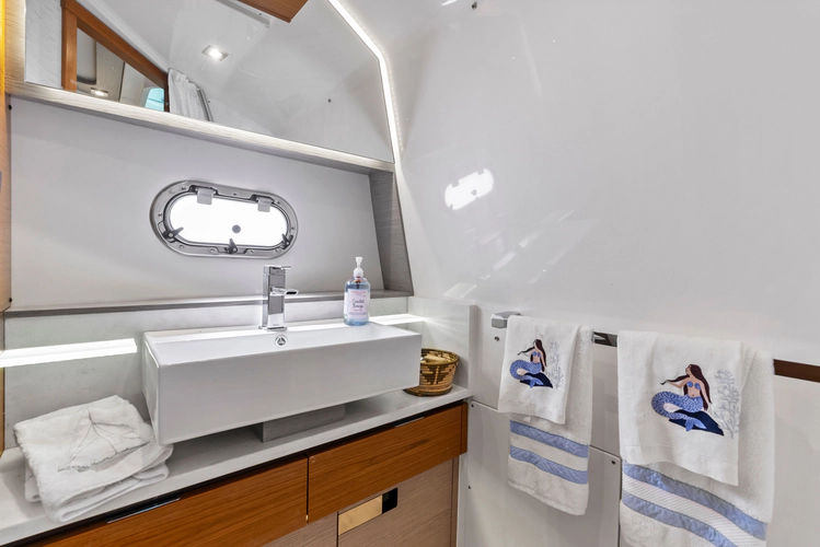Enclosed Head and Shower: electric freshwater toilet, shower wand, Designer sink and vanity, base cabinetWe offer the details of this yacht in good faith but cannot guarantee the accuracy of this information or warrant the condition of any vessel listed for sale. All listings are subject to prior sale, price change, or withdrawal from the market without notice and are provided as a convenience to clients; they are not intended to convey direct representation of a specific yacht for sale.