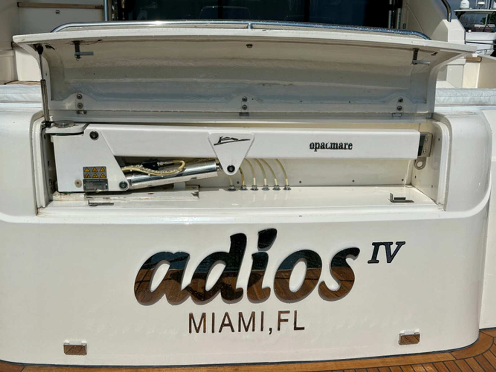 A molded in swim platform with teak overlay and a portside transom gate provide easy access to the cockpit, which is also finished in teak. The cockpit offers bench seating across the transom and a freshwater shower to port, creating a comfortable space for relaxation or preparing for time on the water. Portside steps lead up to the Bridge.