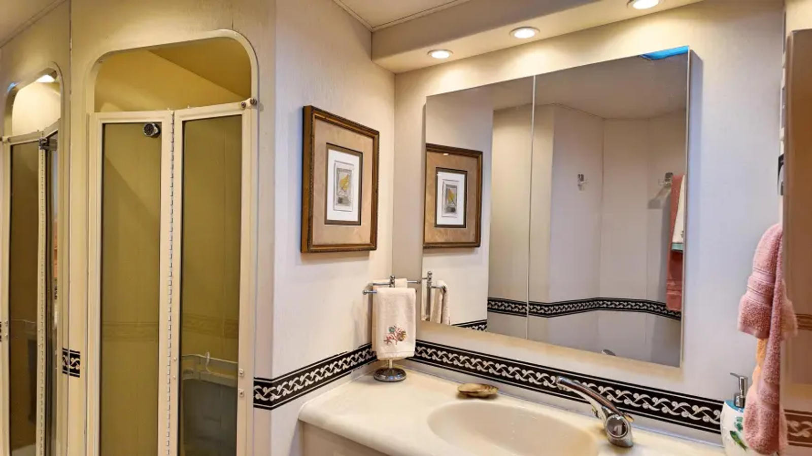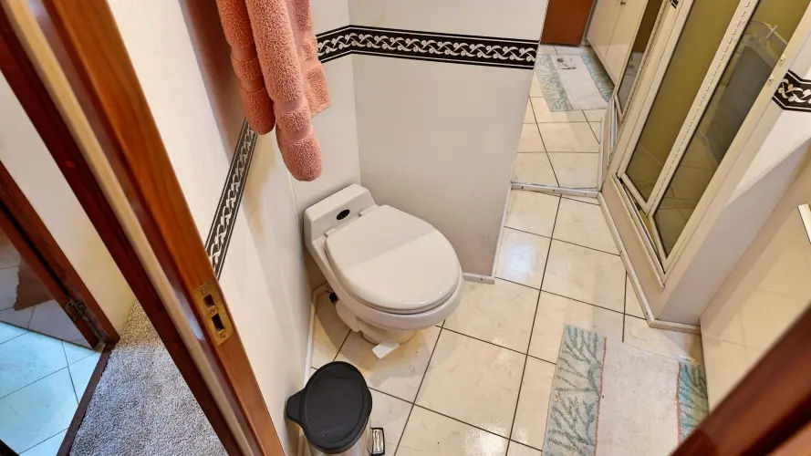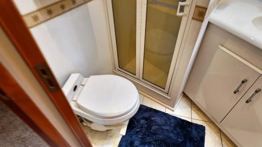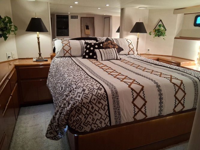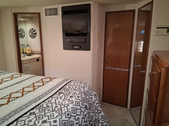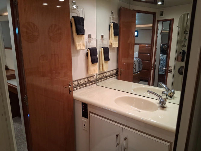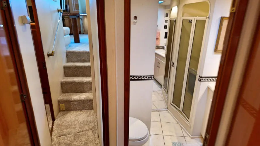 As you walk down the stairway towards the primary you can enter the engine room off to your right through the closet. You have a centerline King size bed with tons of storage space. On the port side you have a vanity with ample lighting. Private head with vanity, toilet, and walk in shower.