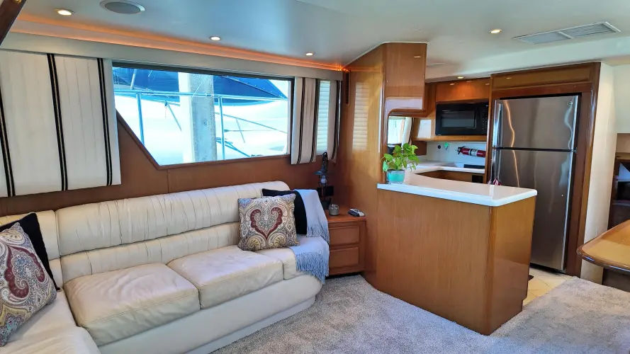 All owners have taken exceptional care of this Viking. It shows as you step into the salon with new carpet. THRILL A MINUTE III is very clean. Off to the port side you have a L-shaped sofa with ample storage below. Currently there is a 32” Samsung smart tv in the Salon.