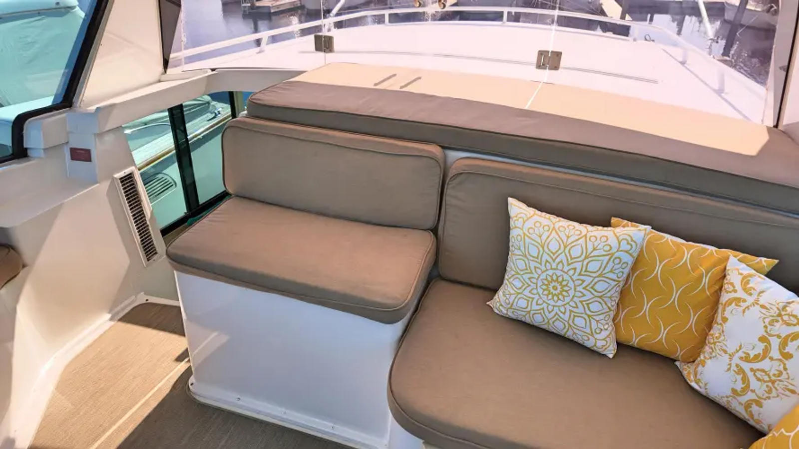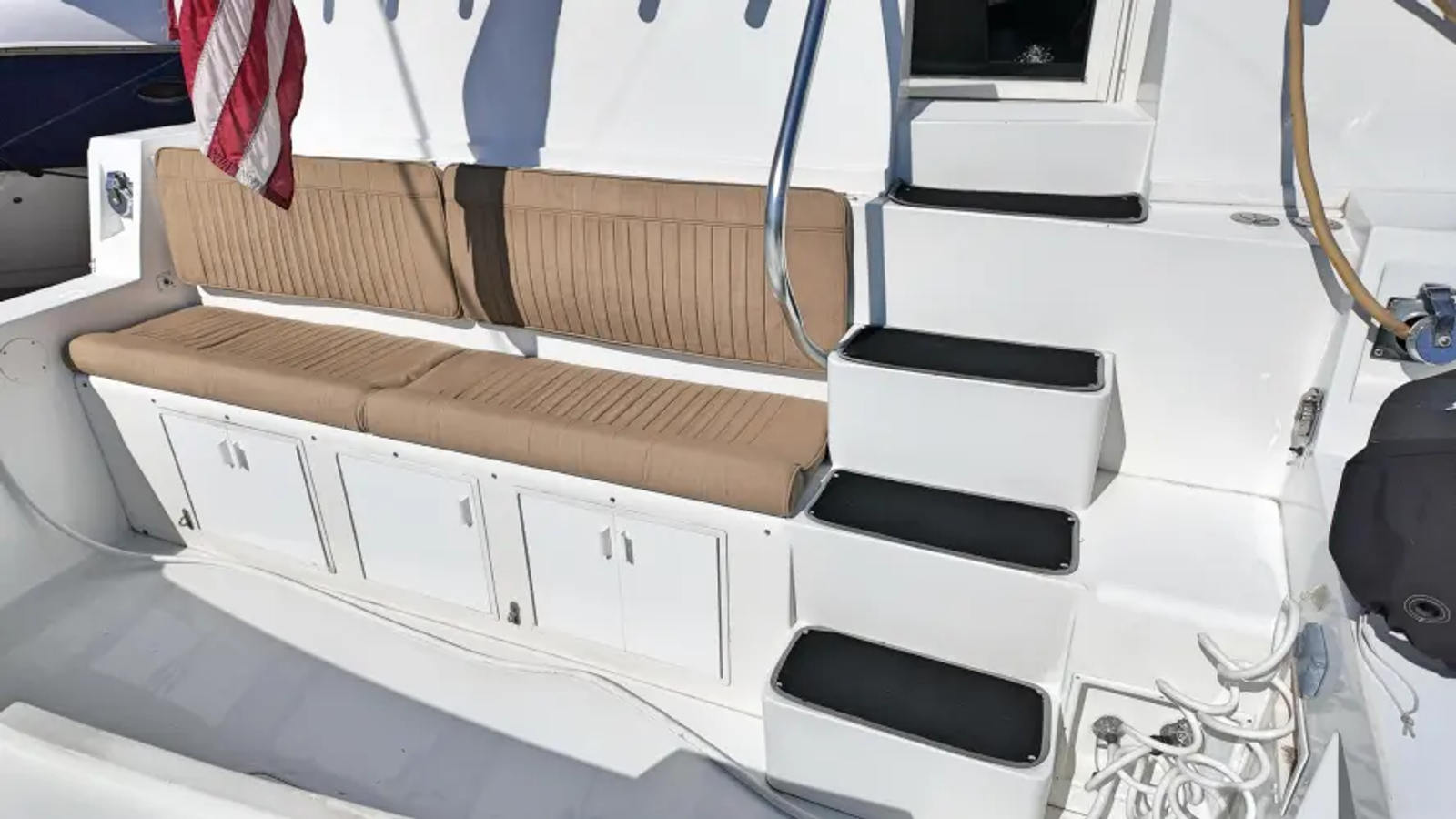 - Custom built-in fiberglass L-shaped couch in aft-deck with storage