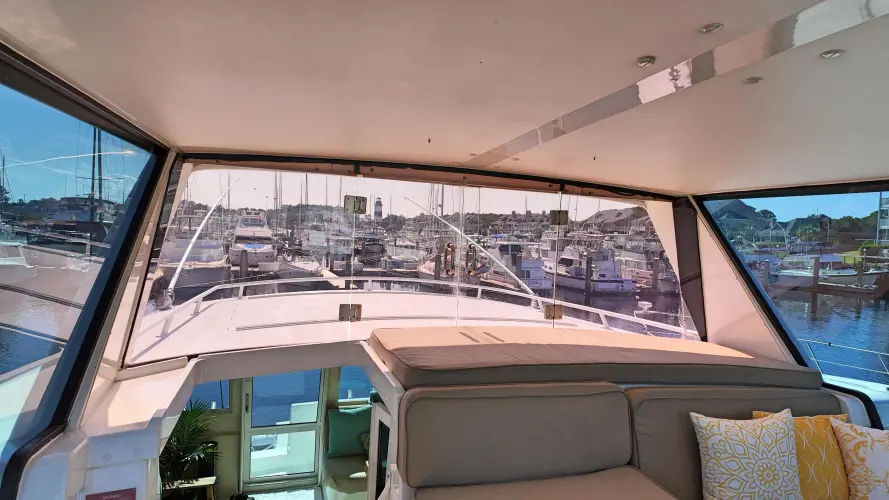 Step up into the bridge of this Viking 60 and take control of the helm with comfort. Updated Simrad electronic package for navigating your next trip. This flybridge is a fully enclosed conditioned space with great visibility. There is a molded in L shaped sofa and a secondary bench seat for guest to join the captain. There is a Yacht controller to remotely control mechanical systems for ease of maneuvering this Viking.