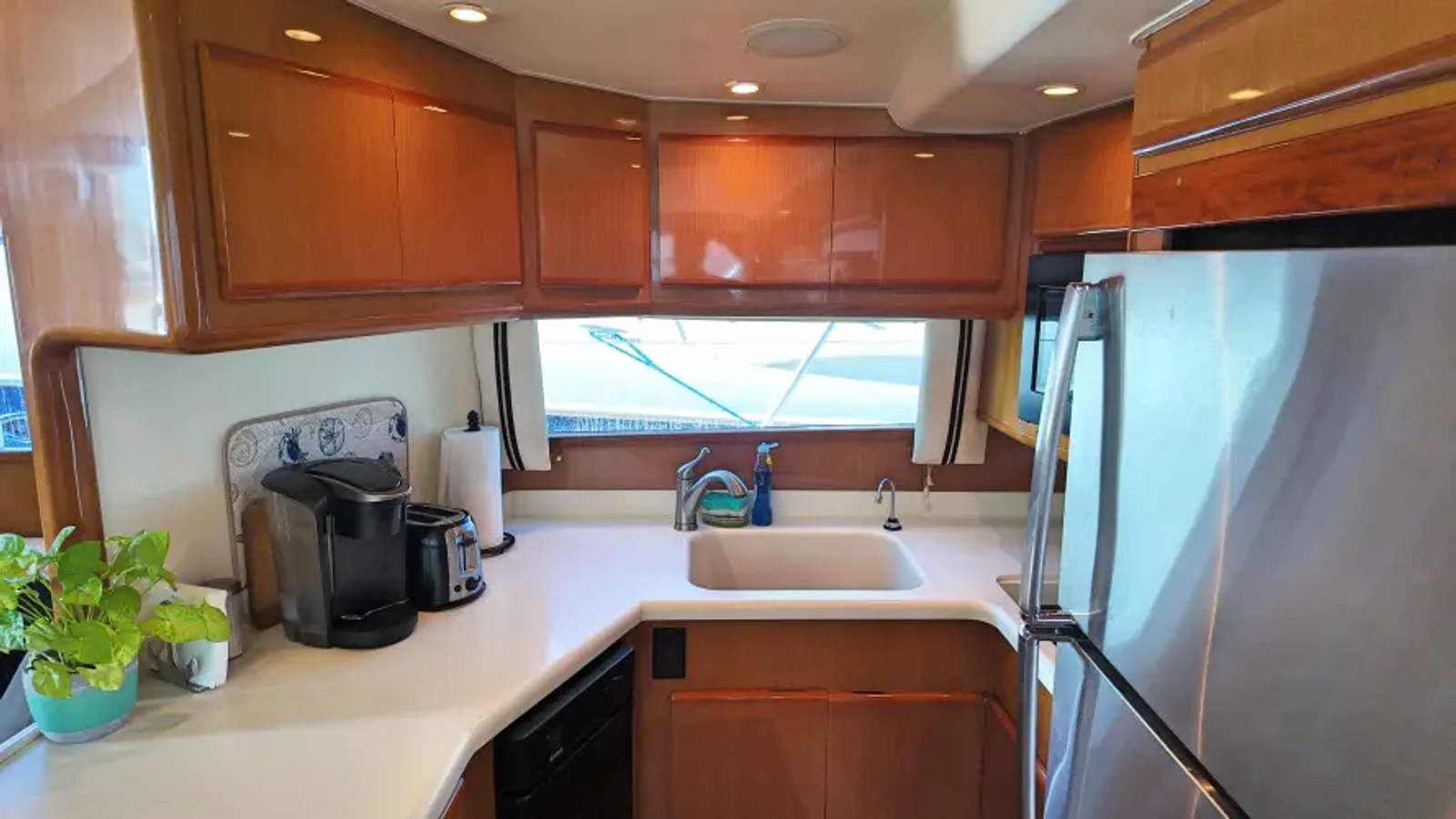- Teak cabinetry (starboard, 3 drawers, 3 cabinets)