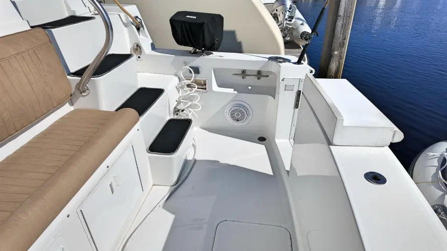 As you step onboard THRILL A MINUTE III, you have plenty of room in a spacious cockpit with an aft facing bench seat. She is out fitted with custom rod holders and Rupp Z-30 outriggers great for fishing off shore. The Glendinning system makes for ease of breaking down and setting up the shore power system. Dockside H2O connection as well. Finally you can walk up the molded in stairway to the Aft deck.