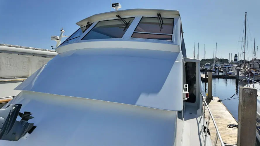 Step up into the bridge of this Viking 60 and take control of the helm with comfort. Updated Simrad electronic package for navigating your next trip. This flybridge is a fully enclosed conditioned space with great visibility. There is a molded in L shaped sofa and a secondary bench seat for guest to join the captain. There is a Yacht controller to remotely control mechanical systems for ease of maneuvering this Viking.