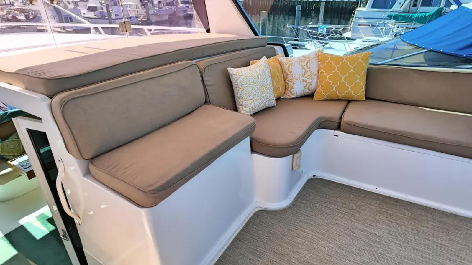 - Custom built-in fiberglass L-shaped couch in aft-deck with storage