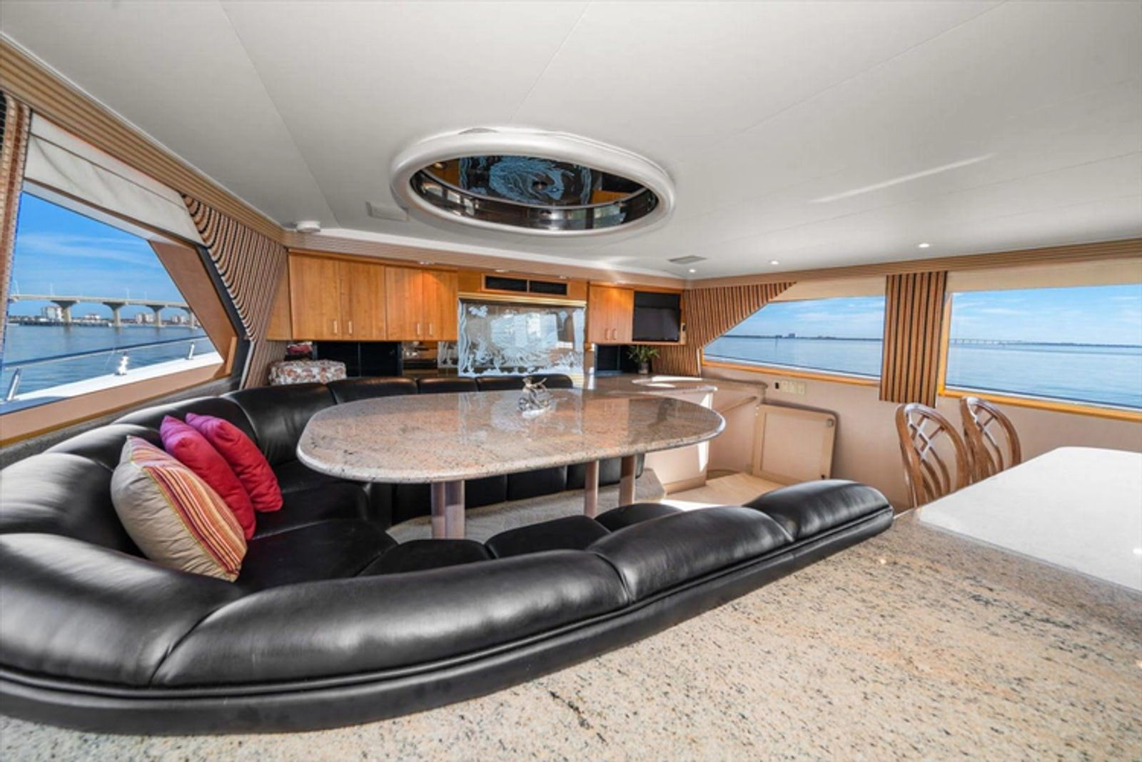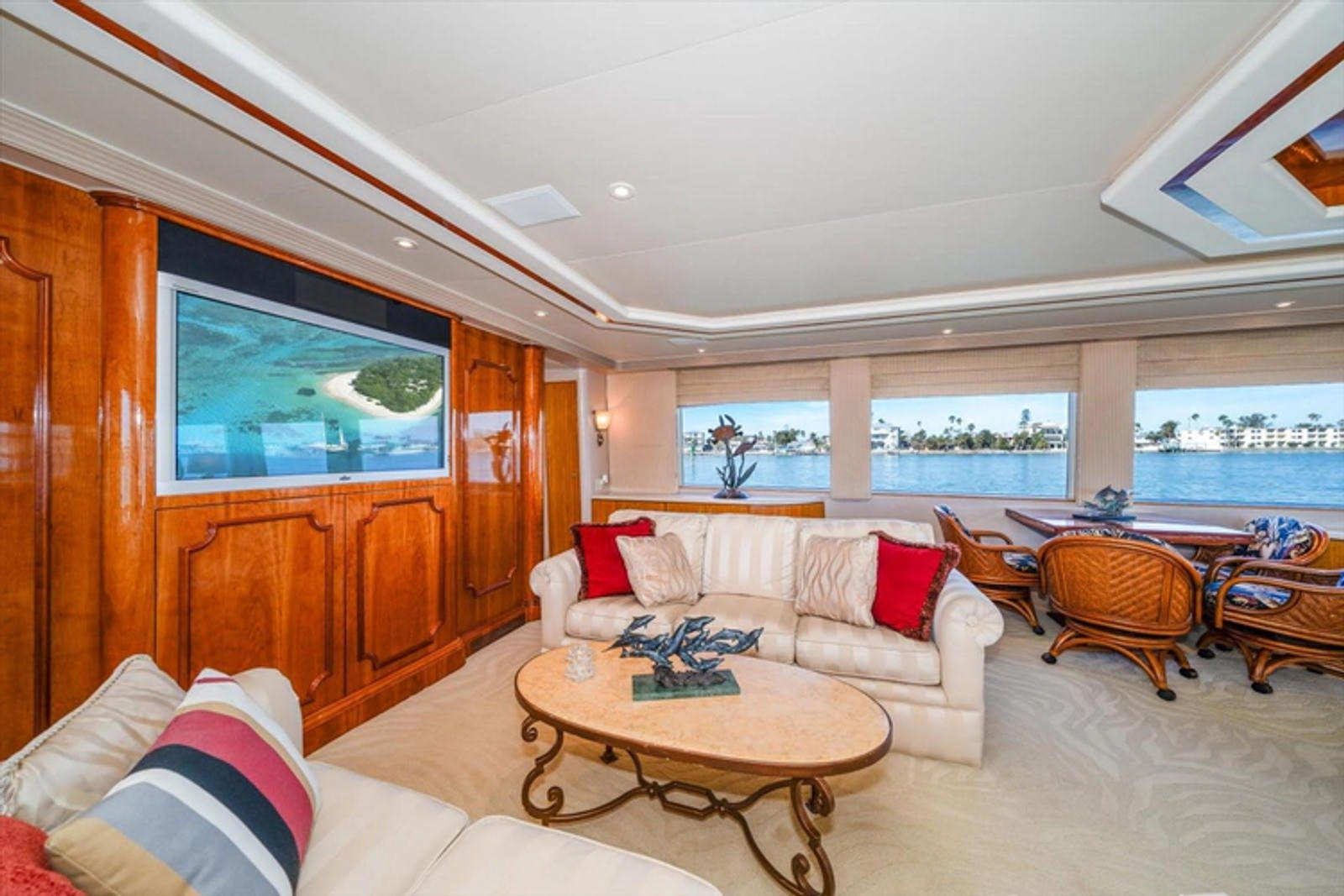 The open luxury Main Salon is very large with a custom entertainment center forward with custom wrap-around sofas.