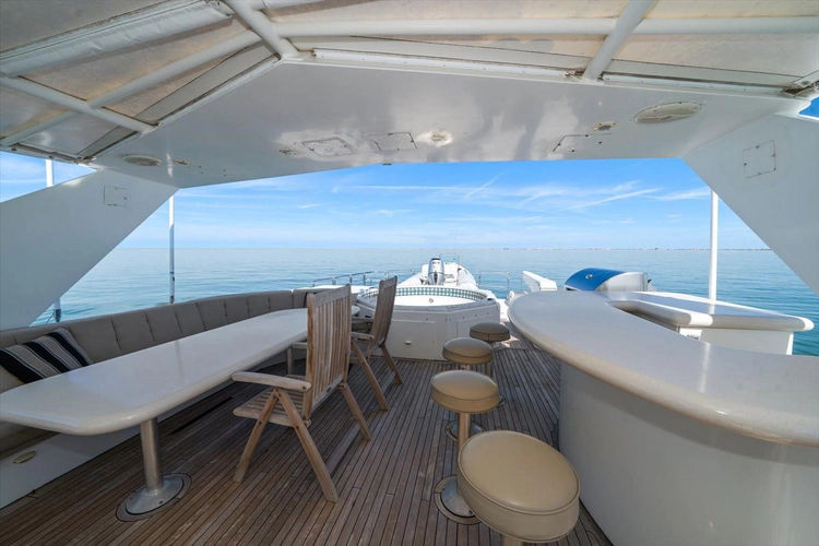 The Flybridge/Sundeck is extremely large with a Jacuzzi in the center. There is a custom wet bar with 4 stools and a whirlpool icemaker. Starboard dinette seating for 15-20 people. There are three custom Steel Crown chairs raised and have footrests to accompany the captain while cruising. A sundeck measuring a massive 19ft x 13ft area.