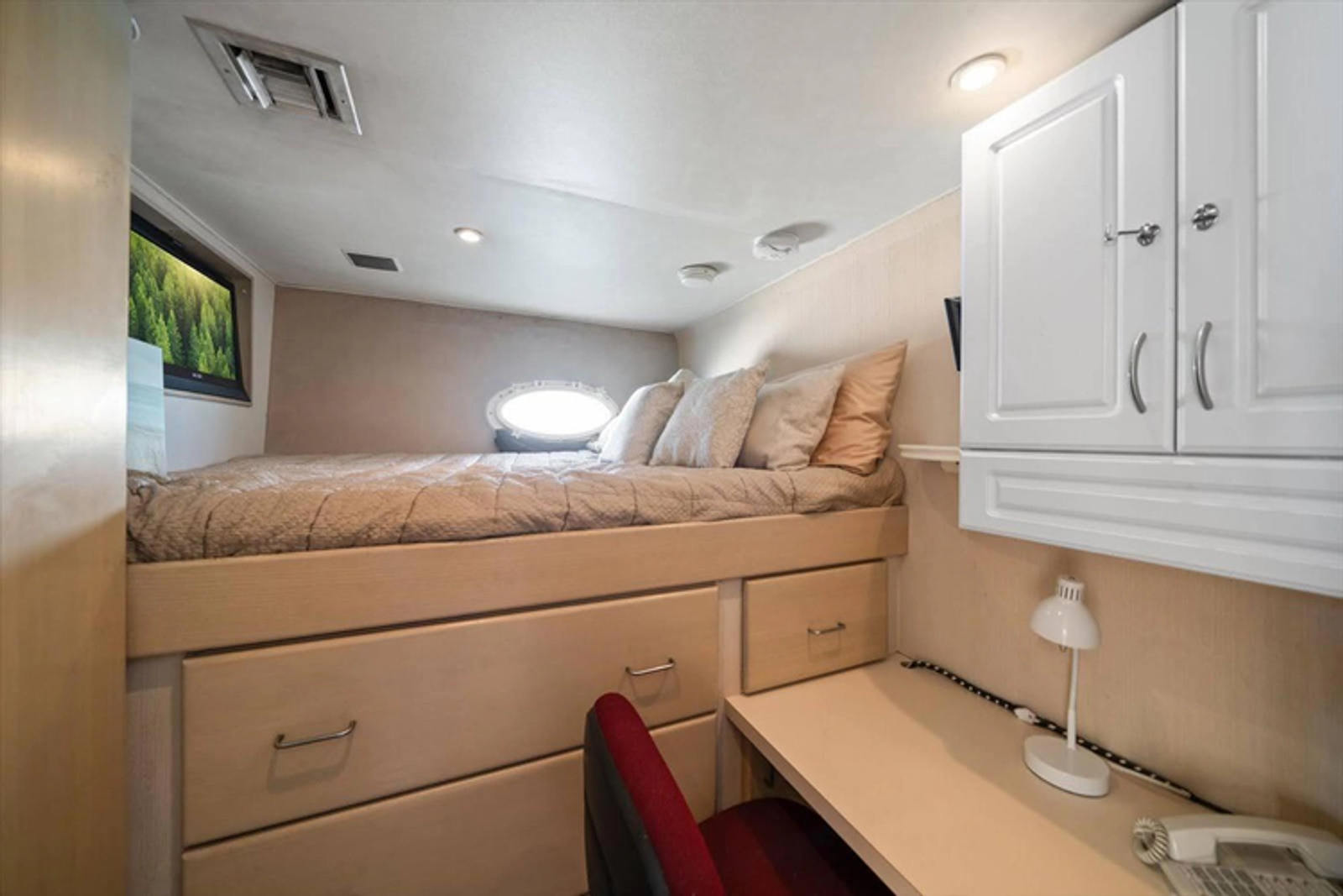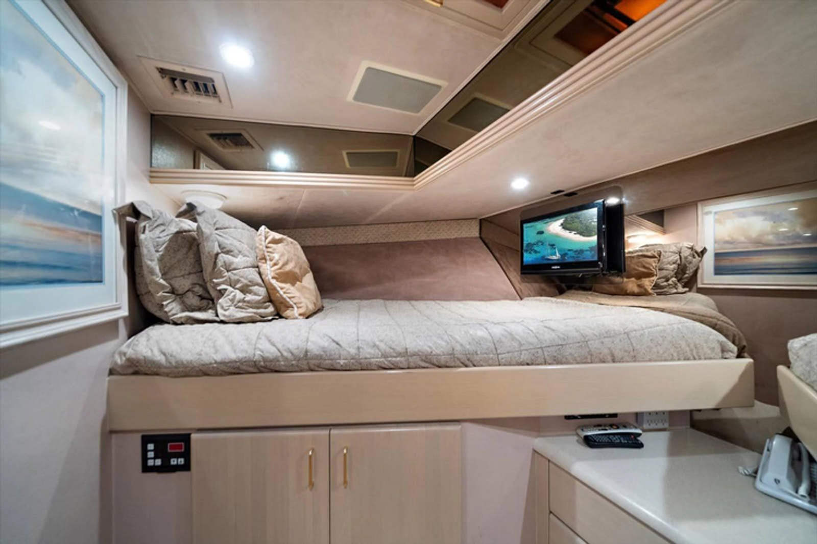 To starboard, there is a double birth (2 twin beds), to port there is a single birth (1 queen bed) and then there is a beautiful full beam king master suite, with sitting area with a large shower separating twin heads and vanities. All, of the guest staterooms have TVand#39;s and audio equipment, large closets for plenty of storage and open space.